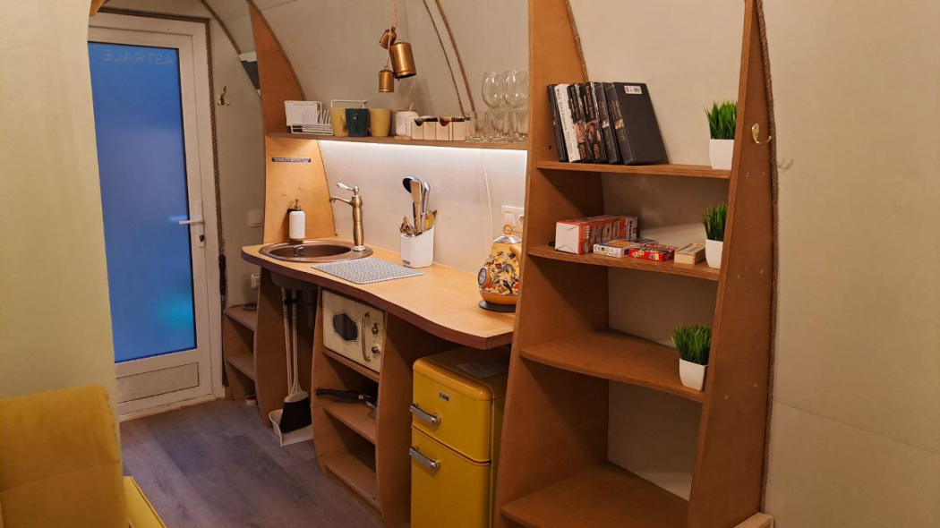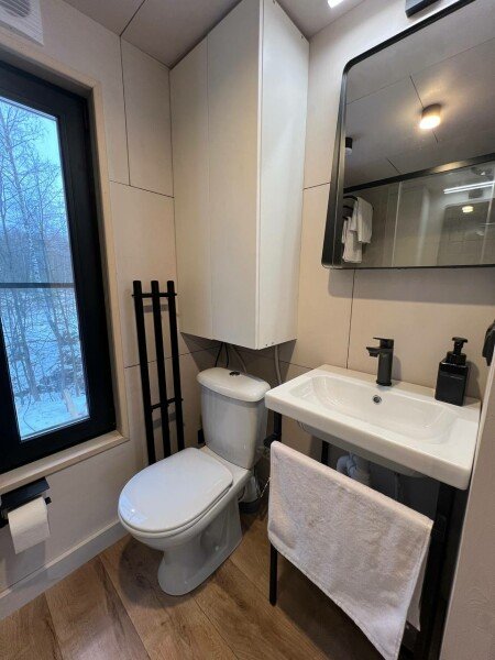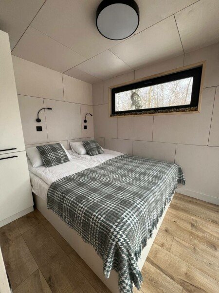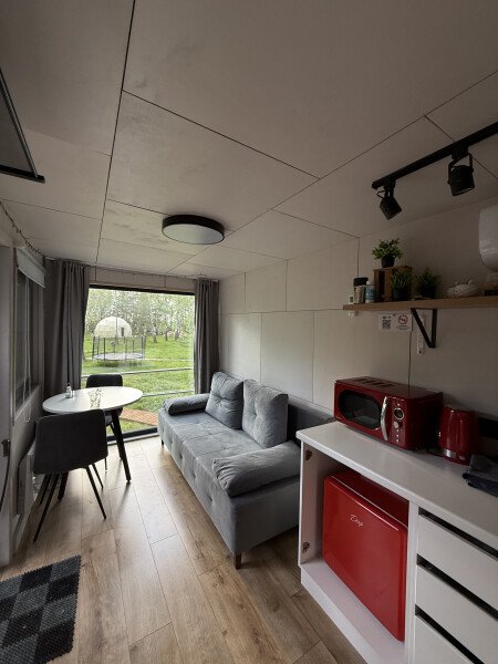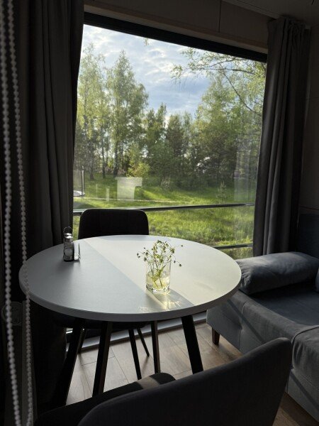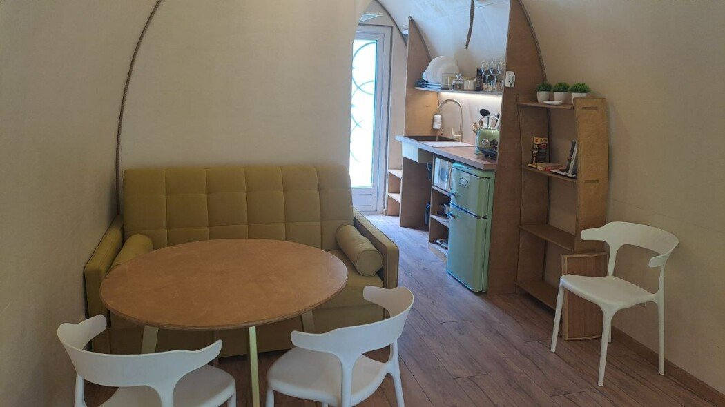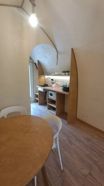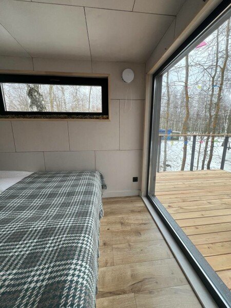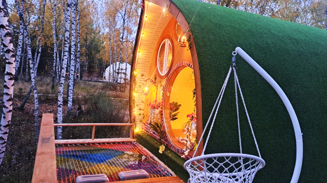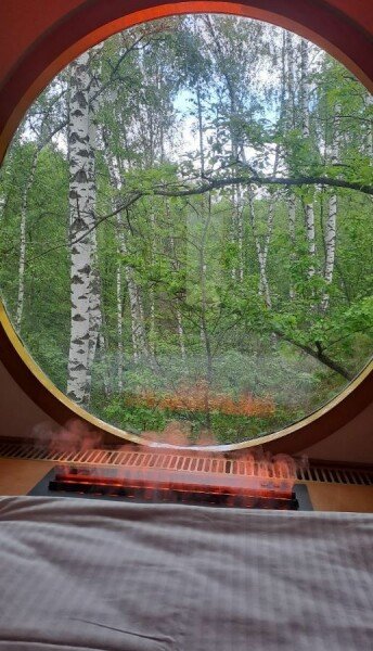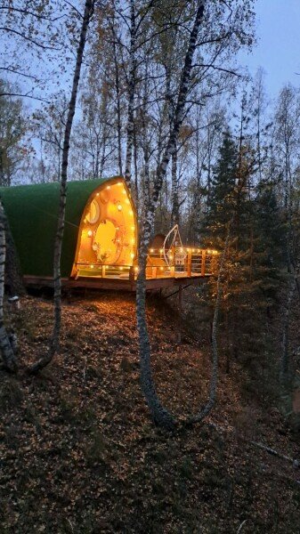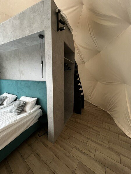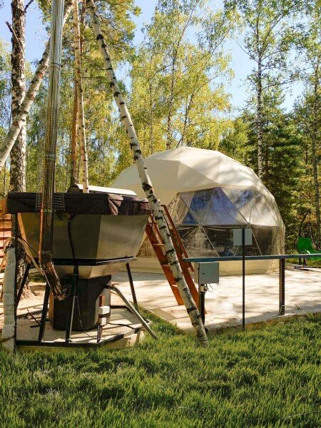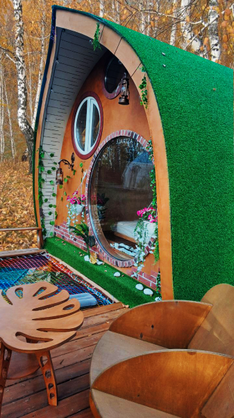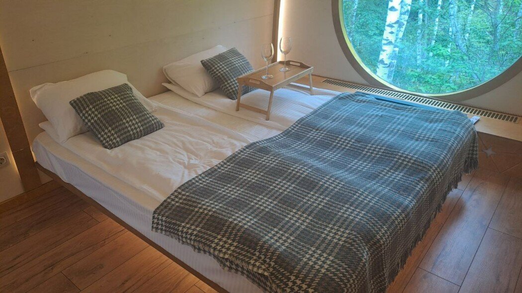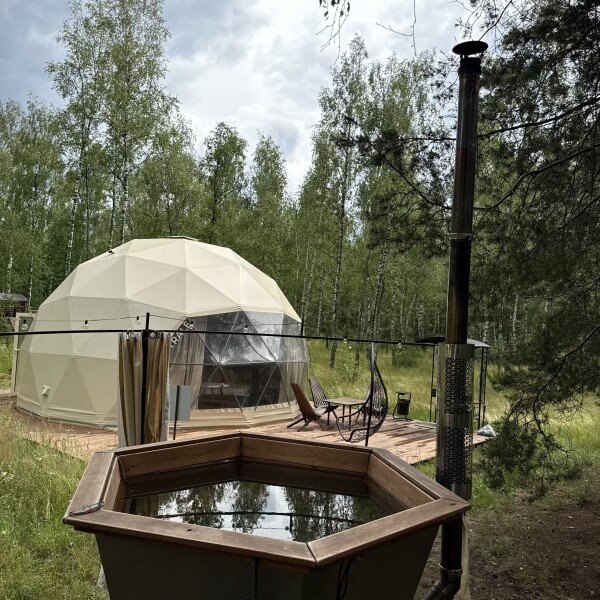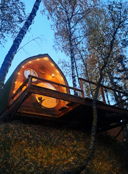 Этот уникальный домик необычной формы — единственный в своём роде, созданный для тех, кто ценит уединение и стиль. Расположенный на высоком холме в лесу, он дарит потрясающие виды и ощущение полного слияния с природой. Просторная терраса с уютной фурако позволит вам расслабиться под шепот листвы и пение птиц. Интерьер в спокойных, гармоничных тонах создаёт атмосферу умиротворения, а продуманный комфорт — от качественного белья до современного оснащения — делает проживание по-гостиничному приятным. Парящая кровать с камином у большо окна делают провождение времени в домики особенным и теплым. Здесь нет места суете, только тишина, свежий воздух и неповторимый глэмпинг-экспириенс. Ваш идеальный побег от городской рутины начинается здесь!