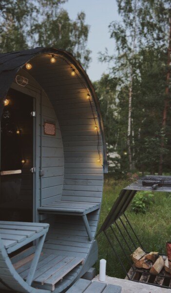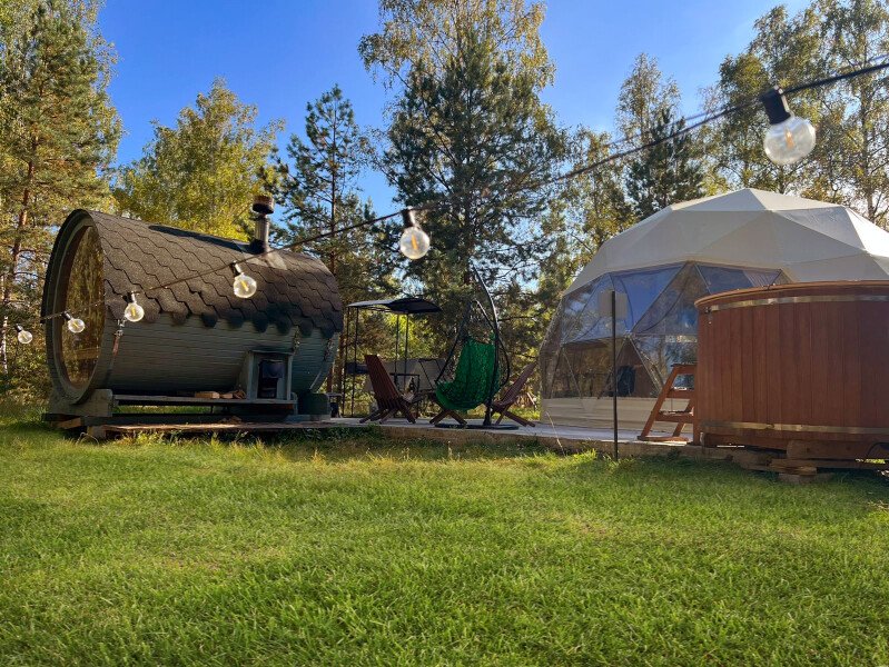 На территории глэмпинга расположены дома для круглогодичного проживания (душ, туалет, спальные места, кондиционер) и банный модуль с собственным банным юнитом: банный чан, японская фурако, русская баня-бочка, финская баня-бочка; общая костровая зона и зона досуга, детская площадка.
