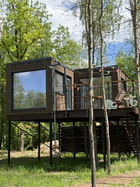 Главная изюминка — живое дерево, пробивающееся сквозь пол веранды, где часть пола заменена сеткой для релакса в обнимку с природой. Вид на лес, романтичные горящие закаты заливающие своим светом дом изнутри. — идеально для семей с детьми, влюблённых и мечтателей.