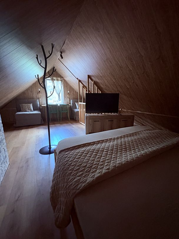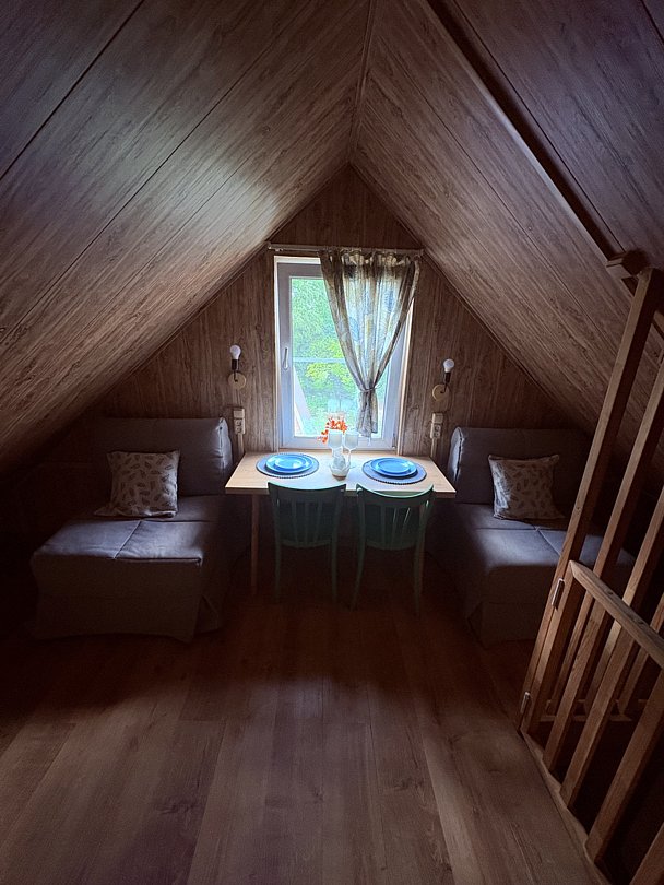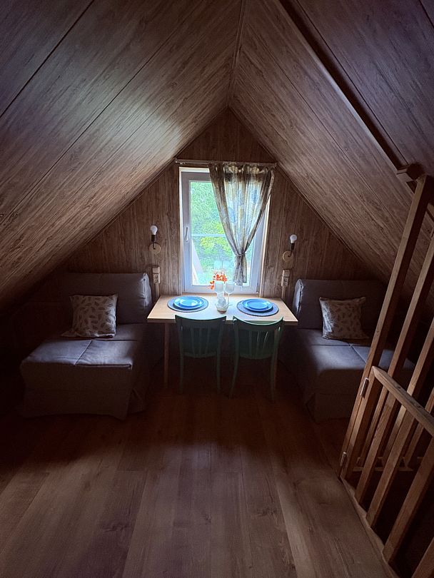 - чердак кровать на 2-ом этаже + раскладной диван на 1-ом этаже;