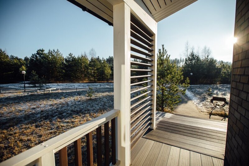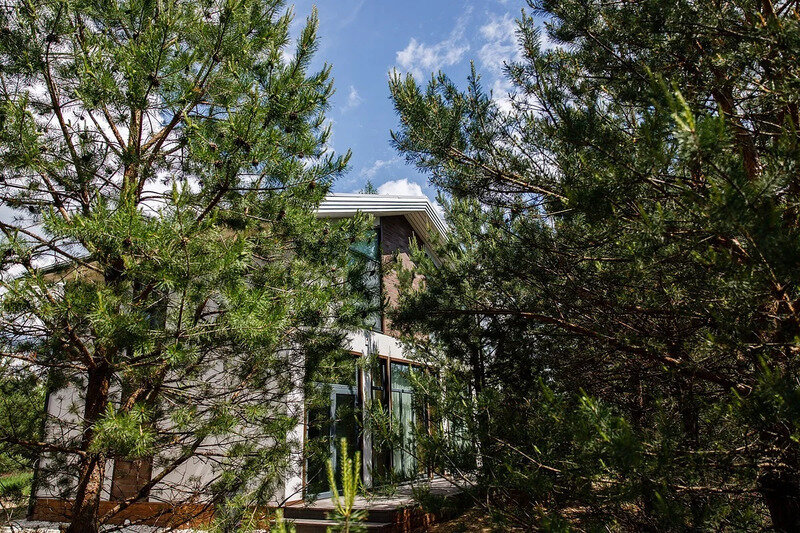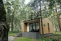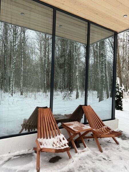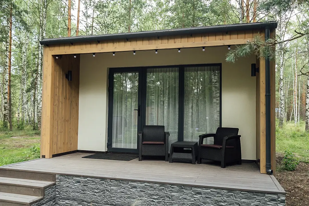 Дом 25 кв.м с видом на смешанный сосново-березовый лес, около дома есть терраса с уличной мебелью и мангалом.