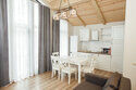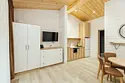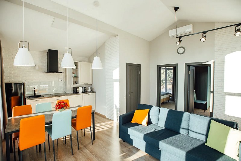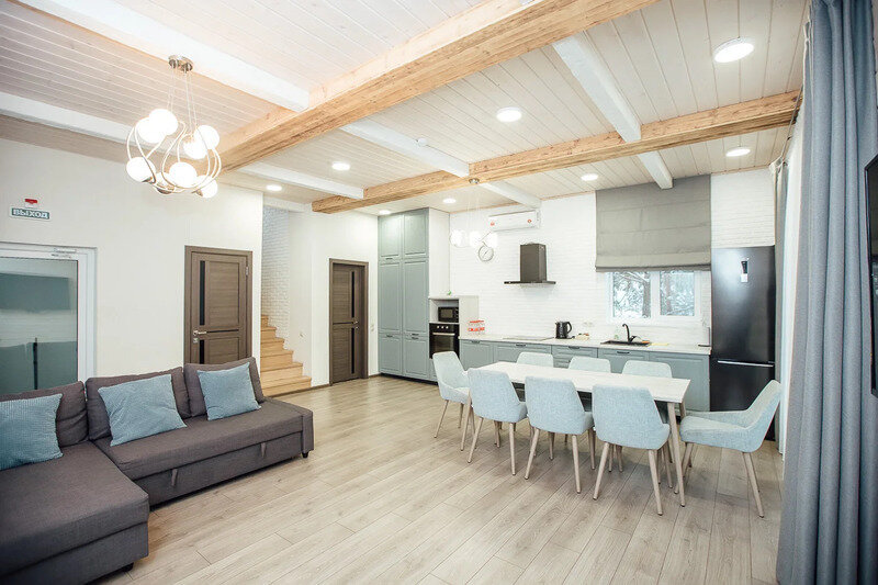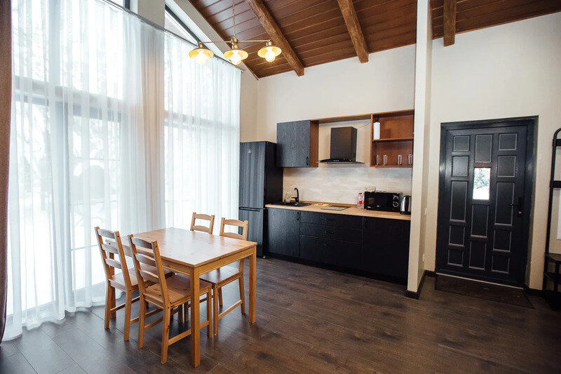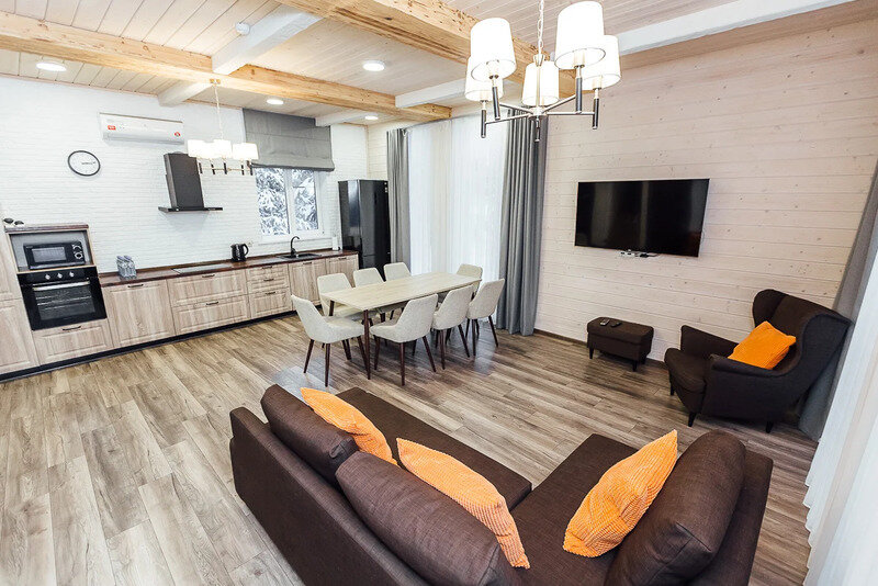 Оснащение дома: двуспальная кровать в отдельной комнате, раскладной диван в зоне кухни-гостиной, зеркало, стол, стулья, тумба для обуви, шкаф для хранения, вешалки. В ванной комнате располагается душевая кабина, туалет, предоставляются полотенца и гостиничная парфюмерия.