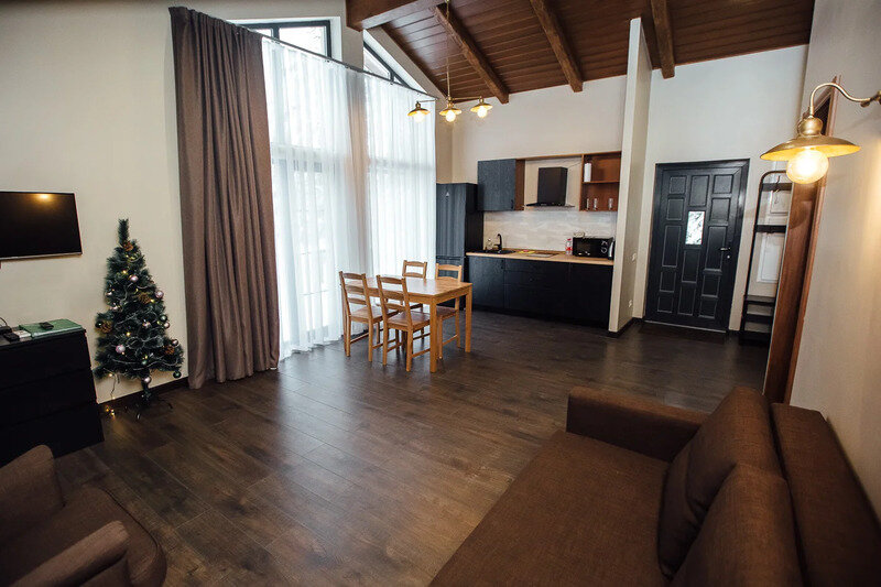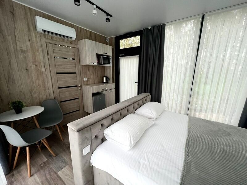 Расположиться гости могут в уютных гостиничных номерах или в эко-домиках на территории. Все номера хорошо оснащены, имеется кондиционер, телевизор, бесплатный Wi-Fi, чайник, холодильник и новая мебель. В собственной ванной комнате установлена душевая кабина или ванна, а также есть набор полотенец и гостиничная парфюмерия. В домиках же имеется кухонная зона, а некоторые из них оборудованы плитой для возможности самостоятельной готовки.