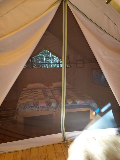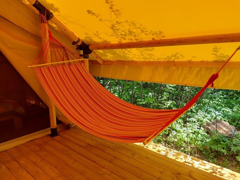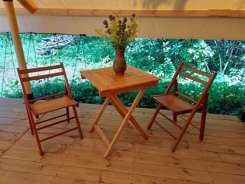 Летний шатер — это просторная палатка с террасой для отдыха в тени деревьев в сочетании с комфортом: кровати с удобными матрасами и белоснежным постельным бельем, душ и туалет в минуте ходьбы от шатра.