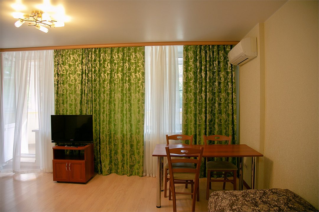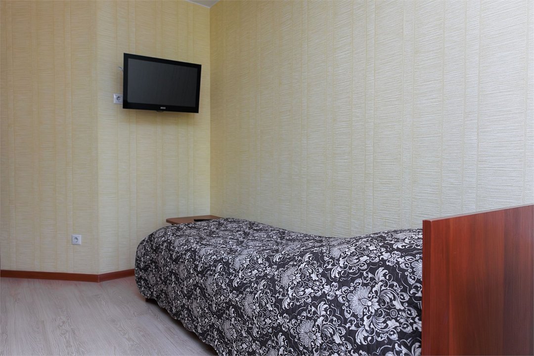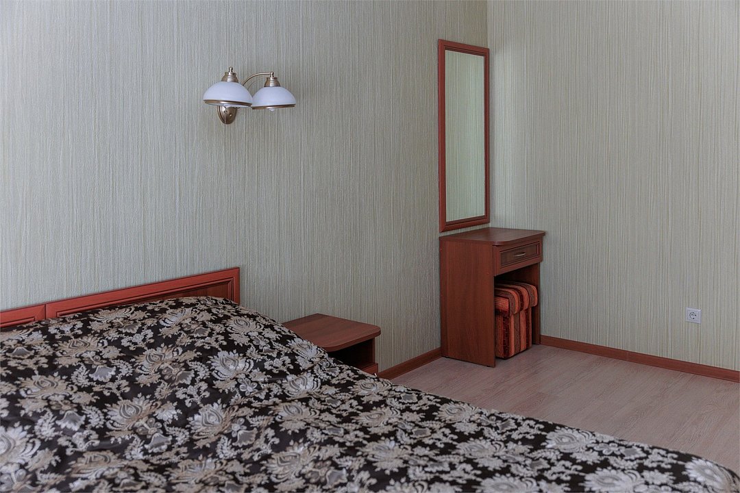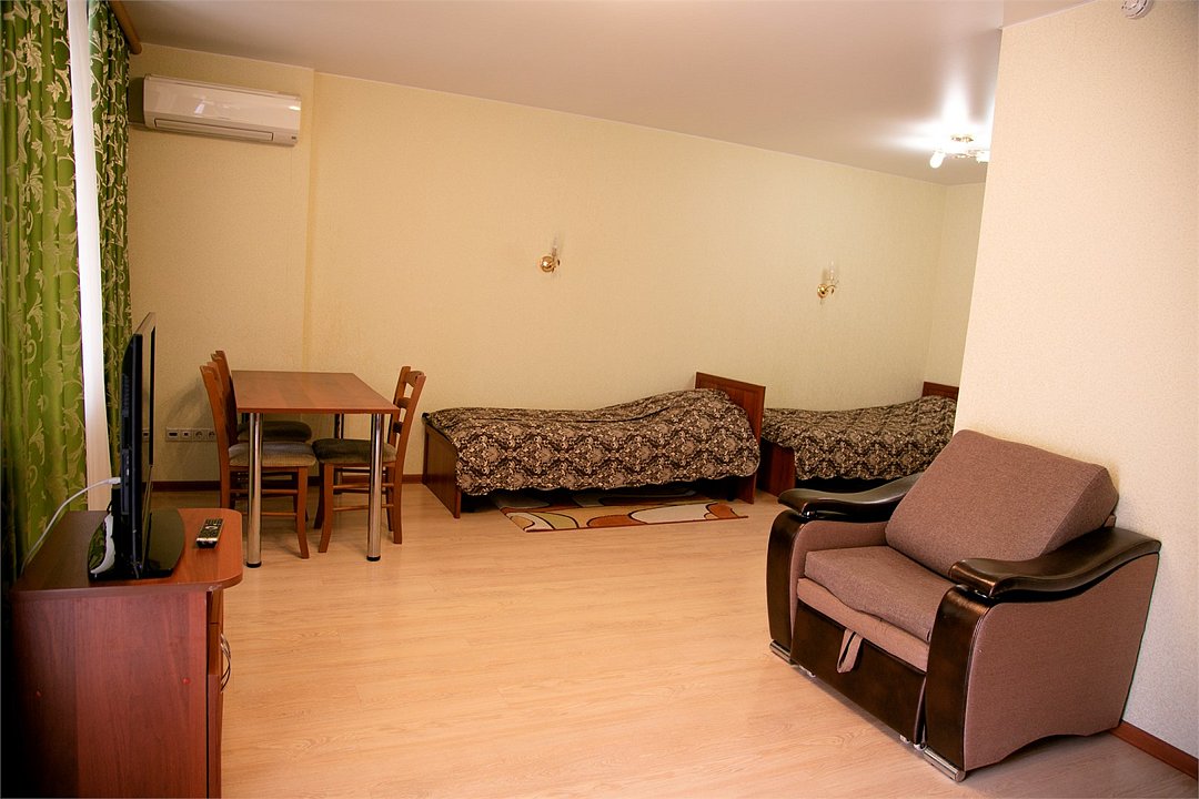 Просторный однокомнатный номер с четырьмя односпальными кроватями (по запросу фиксируются в одну двуспальную). Номер оснащен всем необходимым для комфортного проживания: прикроватные тумбочки, стол, стулья, шкаф для одежды, туалетный столик с зеркалом, двухкамерный холодильник, кондиционер, телевизор, санузел с душевой кабиной, сушилка для белья, необходимый набор посуды. В номере имеется выход на отдельный балкон с видом на лес.