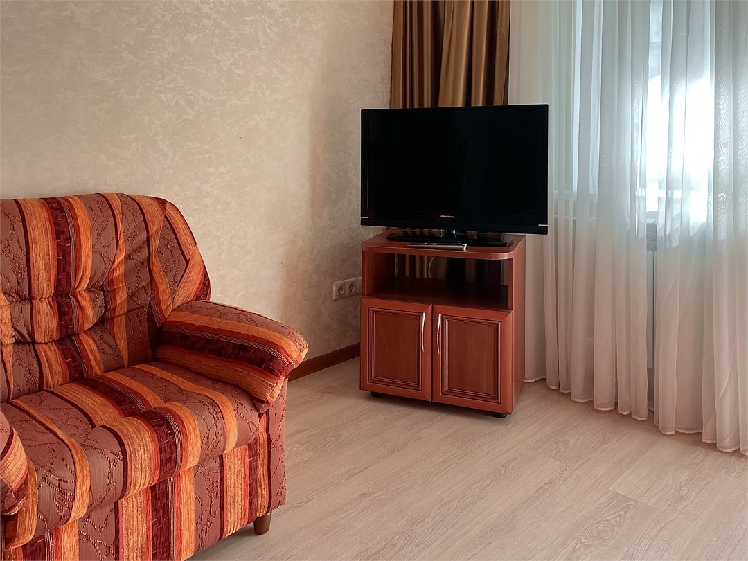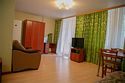 Уютный двухкомнатный номер с одной двуспальной кроватью и мягкой мебелью (диван и два кресла). Номер оснащен всем необходимым для комфортного проживания: прикроватные тумбочки, стол, стулья, шкаф для одежды, туалетный столик с зеркалом, двухкамерный холодильник, кондиционер, 2 телевизора, санузел с душевой кабиной, сушилка для белья, необходимый набор посуды. В номере имеется выход на отдельный балкон с видом на лес.