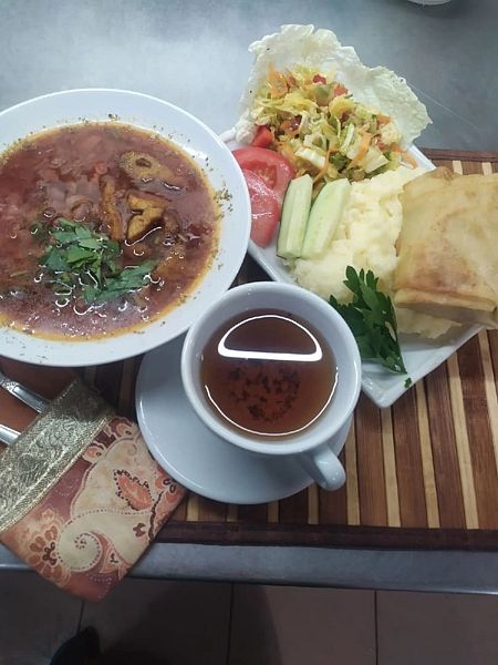 Плов с курицей, мусака с курицей, паста карбонара, макароны по-флотски, куриная отбивная с помидорами и сыром. Чай, какао.