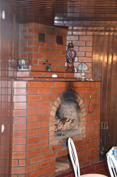 - Гостиная с камином, барная стойка, оборудованная кухня, плита, холодильник, сауна.