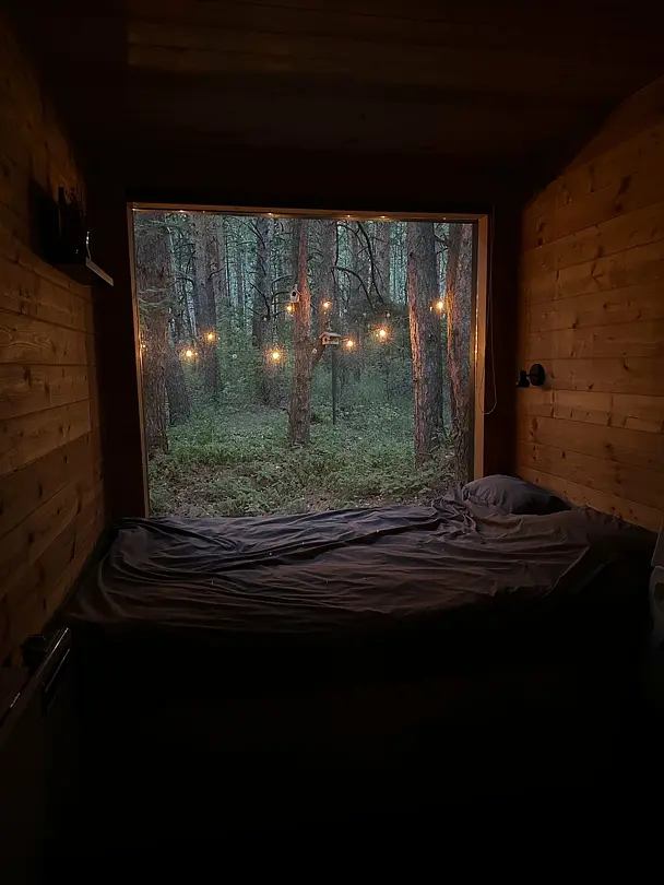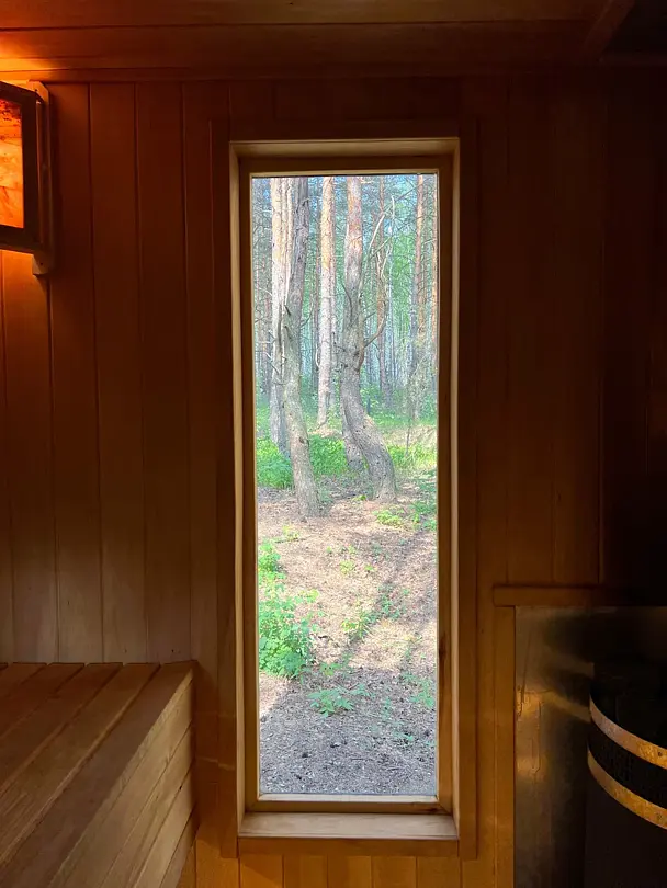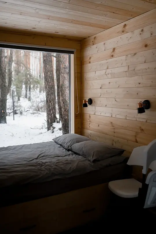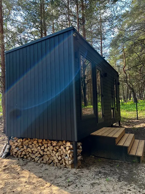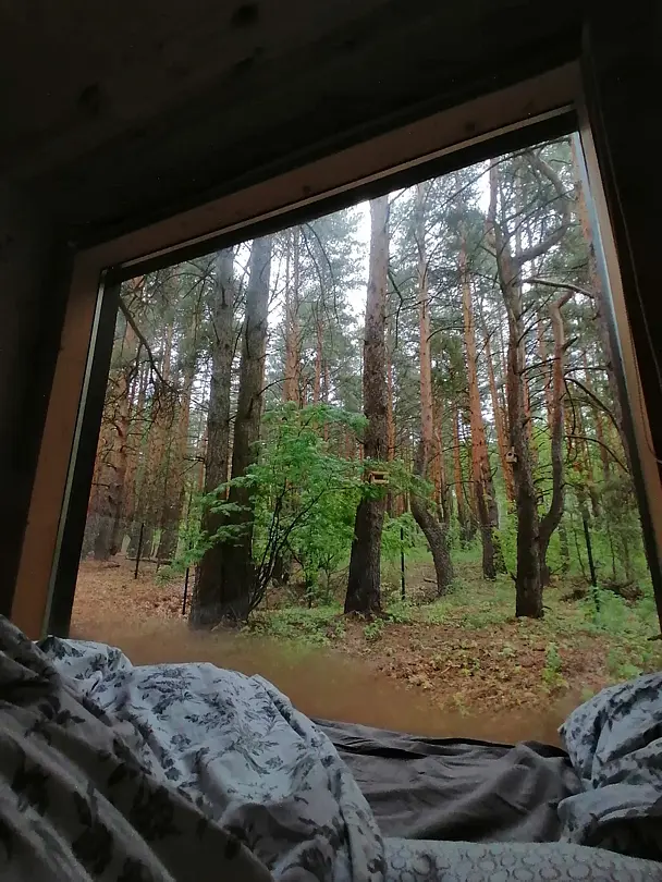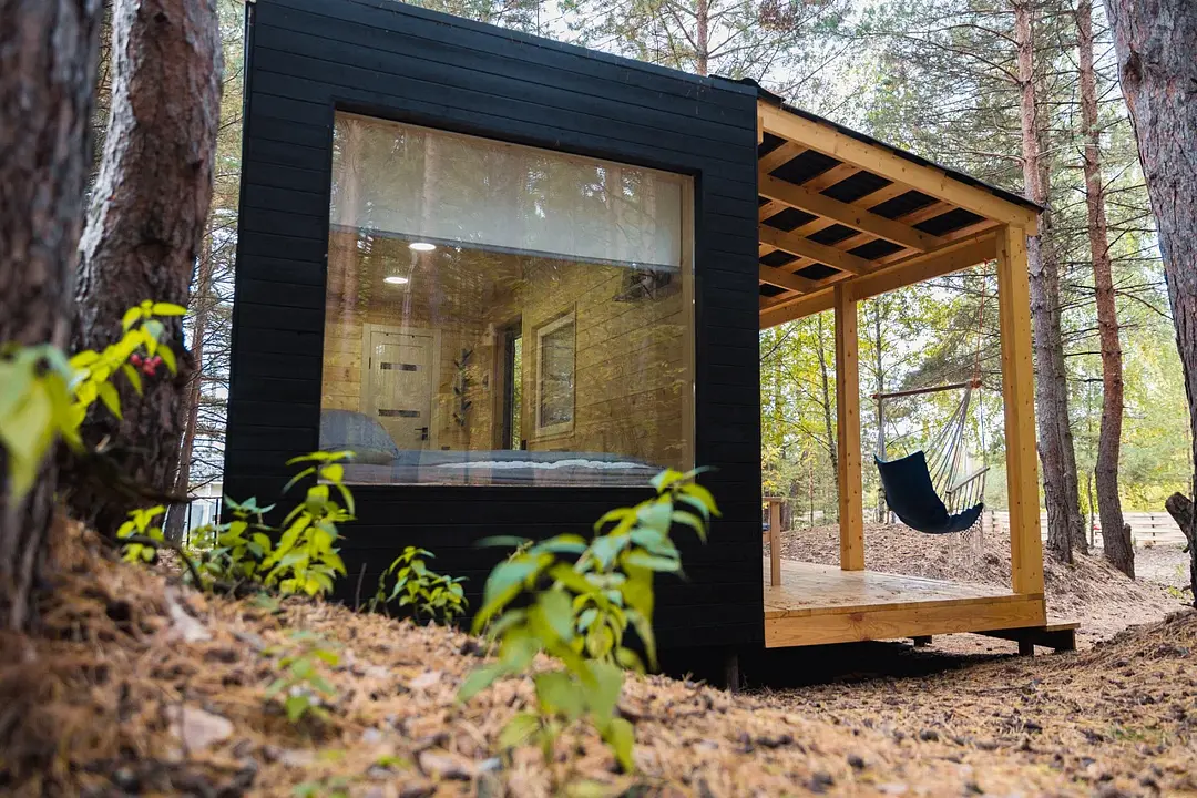 Уникальный минидом с огромным панорамным окном и чаном на дровах в сосновом лесу.