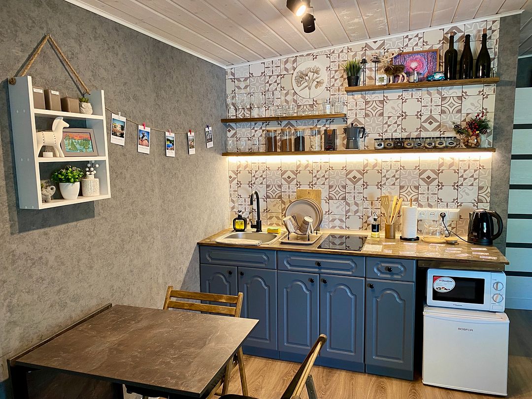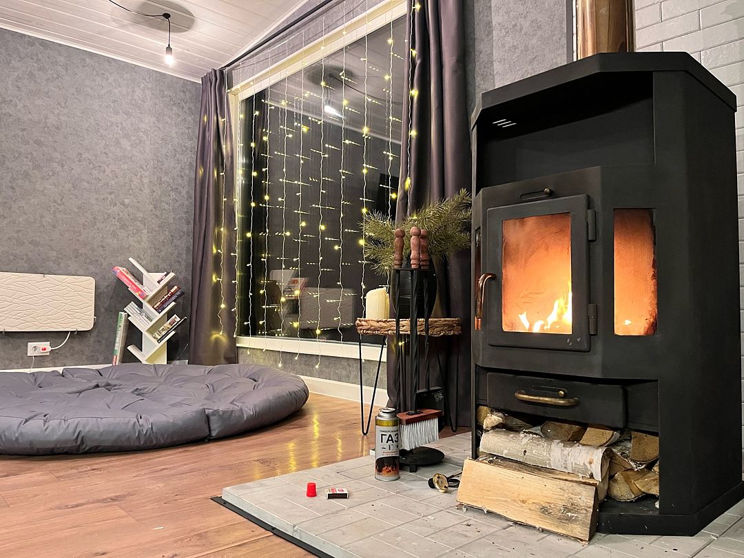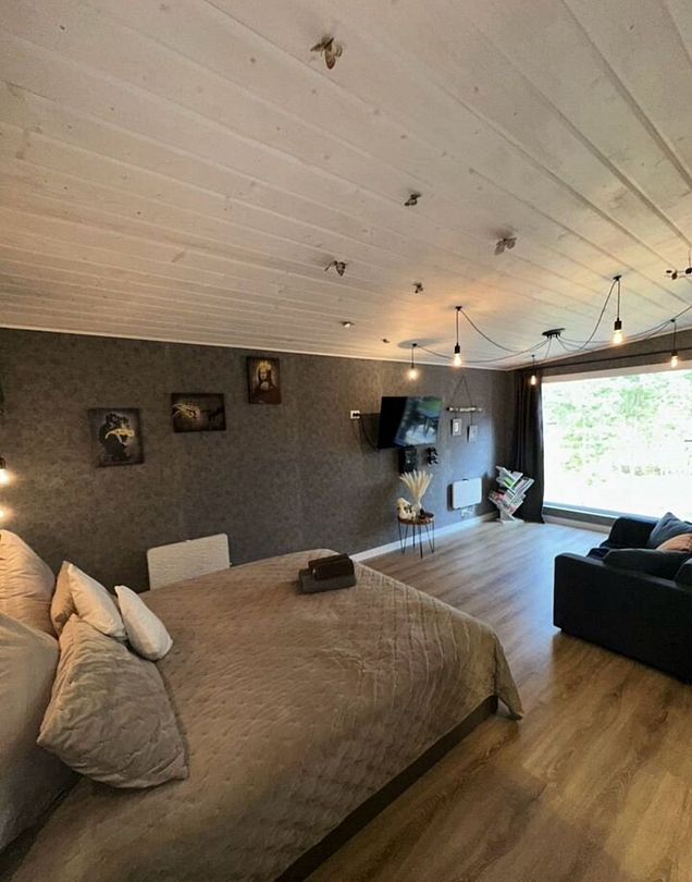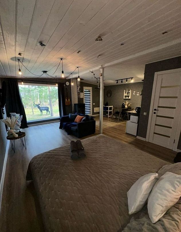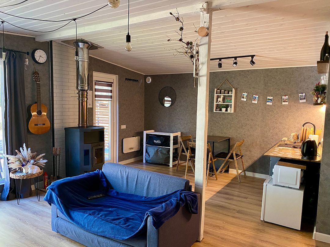 В самом доме вас ждет уют и все необходимое для комфортного пребывания. Просторный и светлый интерьер, включающий в себя спальню-гостиную с панорамным окном, открывающим захватывающий вид на лес, оснащен современной техникой и удобной мебелью. На полностью оборудованной кухне вы найдете все необходимое для приготовления пищи: от современной бытовой техники до полного комплекта посуды. Теплые вечера можно провести у очага, наслаждаясь игрой пламени в камине. Для развлечений в вашем распоряжении телевизор, игровая приставка, разнообразные настольные игры.