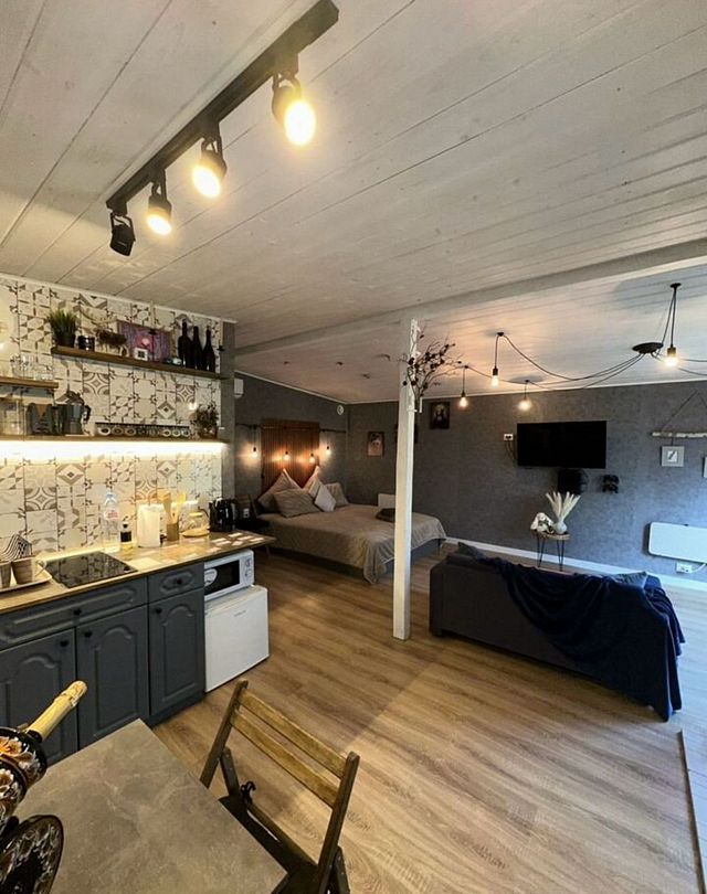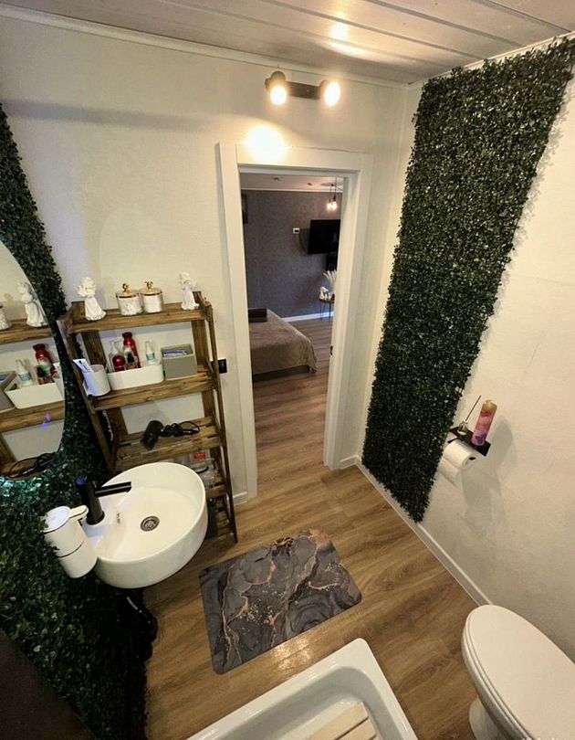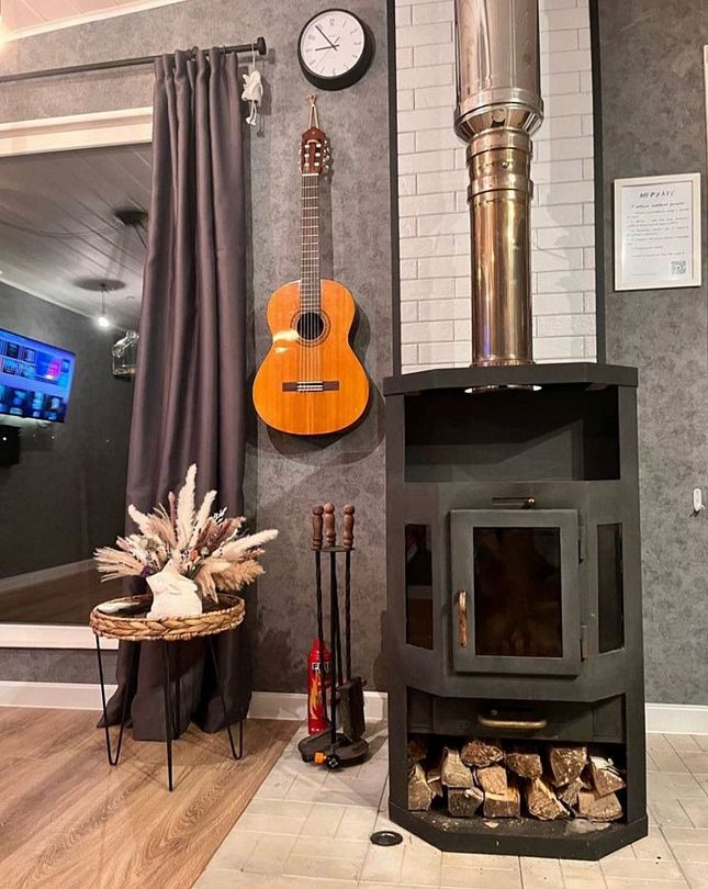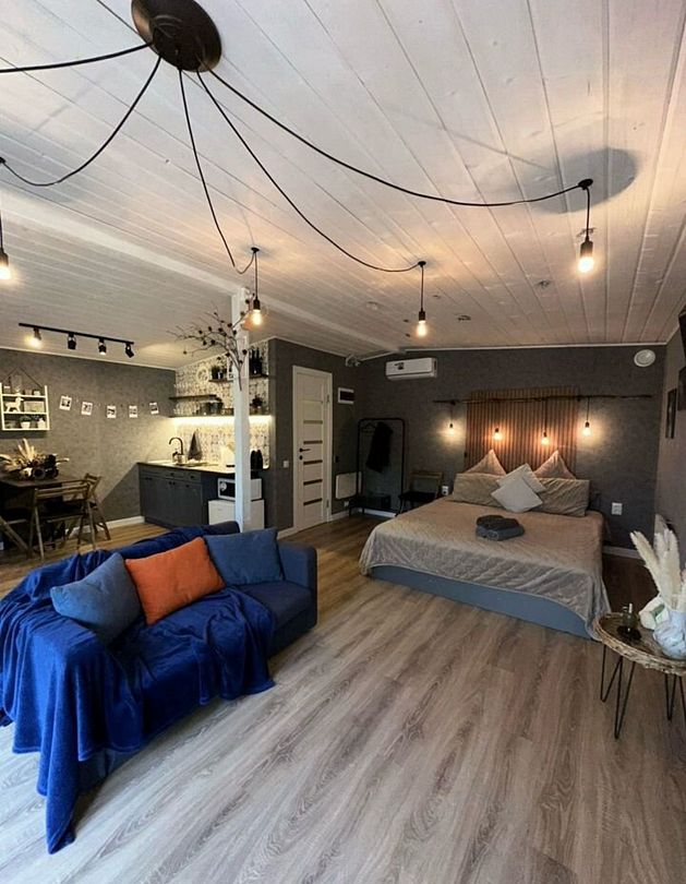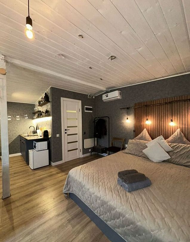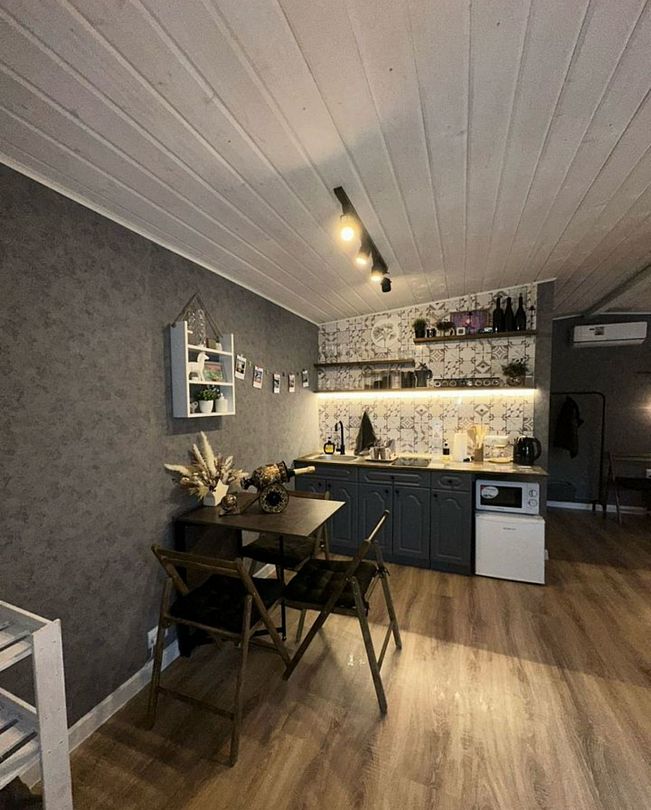 В самом доме вас ждет уют и все необходимое для комфортного пребывания. Просторный и светлый интерьер, включающий в себя спальню-гостиную с панорамным окном, открывающим захватывающий вид на лес, оснащен современной техникой и удобной мебелью. На полностью оборудованной кухне вы найдете все необходимое для приготовления пищи: от современной бытовой техники до полного комплекта посуды. Теплые вечера можно провести у очага, наслаждаясь игрой пламени в камине. Для развлечений в вашем распоряжении телевизор, игровая приставка, разнообразные настольные игры.
