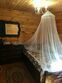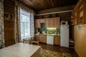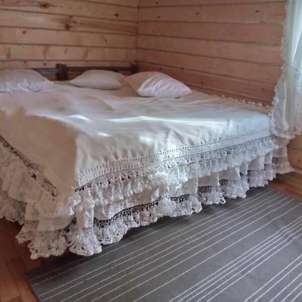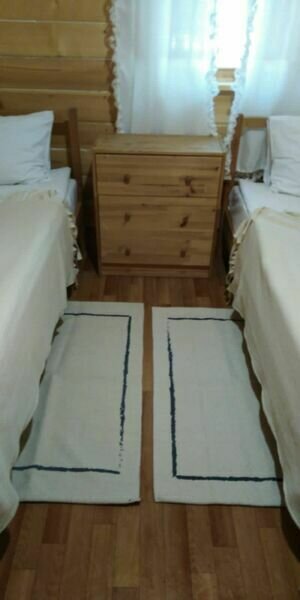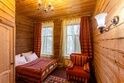 Светлый номер в доме из бруса с двуспальной кроватью. Высота потолков четыре метра. Общая ванная комната на три номера в соседнем коридоре укомплектована бесплатным набором туалетно-косметических принадлежностей.
