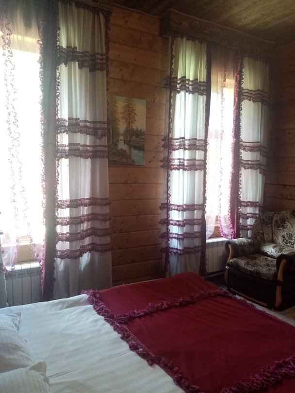 Просторный номер «Зеленый» с двуспальной кроватью и дополнительными креслами-кроватями для детей. Номер имеет общий на три номера санузел в соседнем коридоре. Большая общая терраса, мангальная зона, бесплатная парковка.