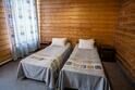 Светлый номер в доме из бруса с двумя односпальными кроватями и креслом-кроватью для ребенка. Высота потолков четыре метра.