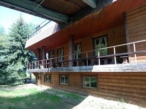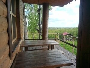 Домик построен из натуральных бревен, в жилой части есть кондиционер. В нем располагается просторная открытая терраса, в которой открывается чудесный вид на берега Оки.