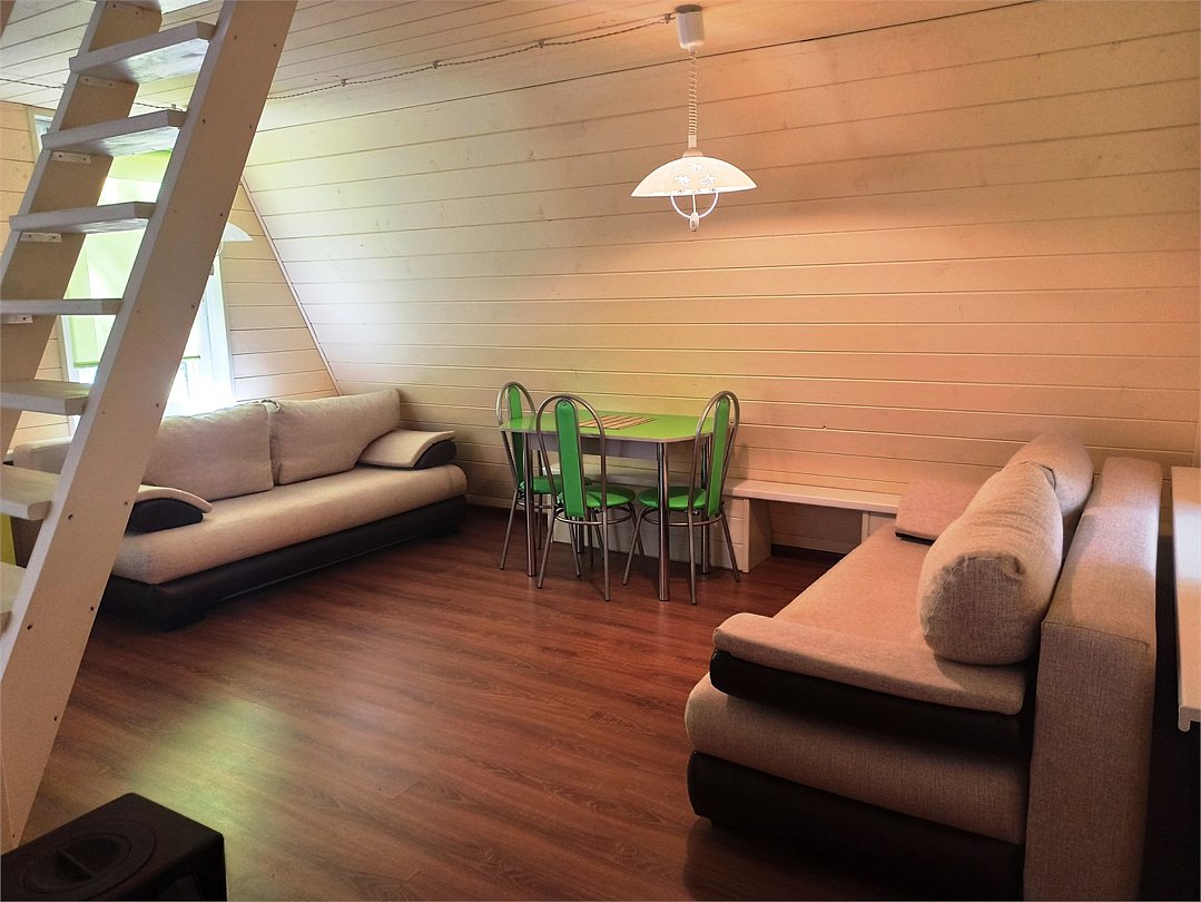 2 взрослых на основных местахБез питанияТариф СемейныйПодробнееУютный домик для полноценного отдыха. Кухонная зона полностью оборудована для самостоятельного приготовления пищи. В наличии холодильник, газовая плита. На первом этаже два удобных, раскладывающихся дивана, шкаф для хранения одежды, стол, 6 стульев, печь длительного горения. Комфортный санузел. Есть горячая и холодная вода. На мансардном этаже 1,5 кровать, диванчик. Веранда. Мангал. Угощение гостей чаем из самовара и лесным медом с собственной пасеки.