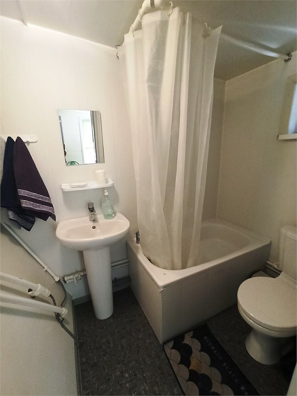 В ванной комнате раковина, ванная, унитаз. В наличии свет, вода горячая и холодная, канализация, газ, печь длительного горения.
