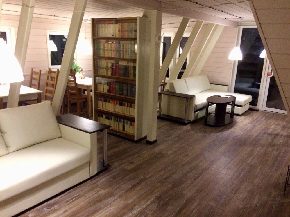 Административное здание «Летучий Корабль» — центр территории. Здесь можно узнать новости, зарядить гаджеты, почитать книги из библиотеки, послушать живую музыку или поиграть в настольные игры.