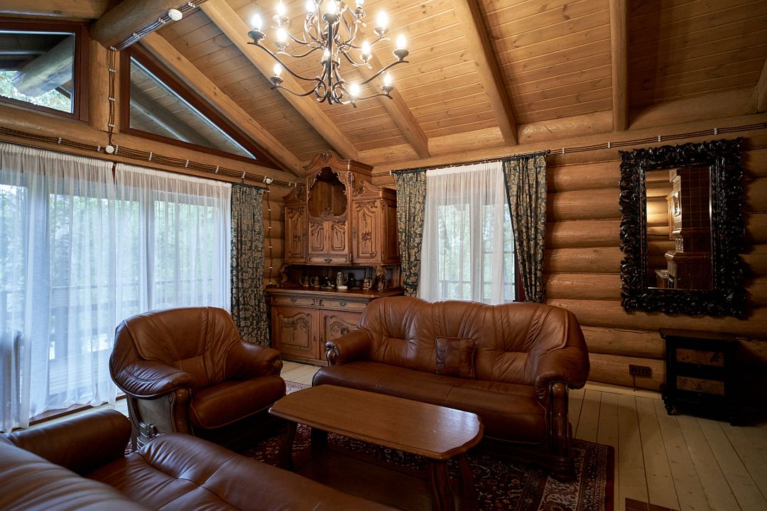 Главный дом спроектирован из рубленного лафета в стиле уютного, русского загородного имения. На территории имеется крытая парковка и банный комплекс с выходом к собственному зарыбленному пруду.