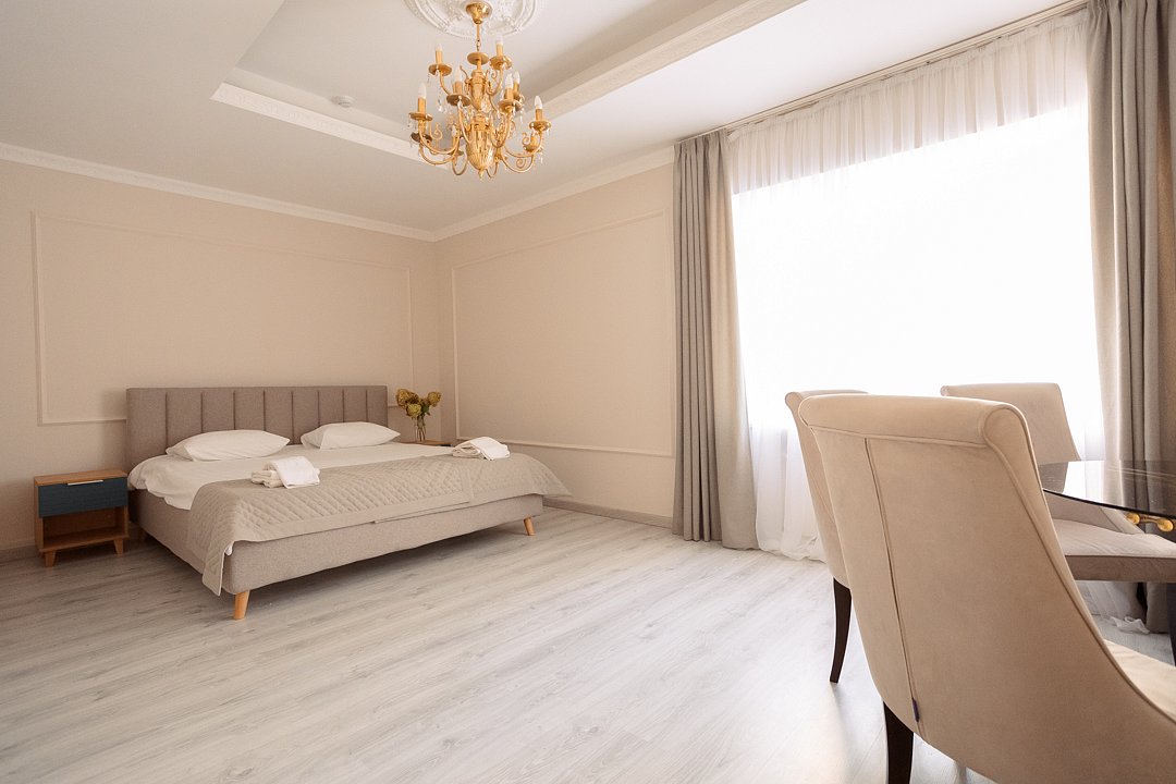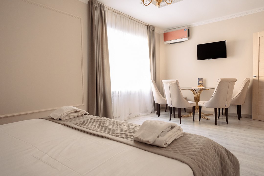 В номере шкаф-купе, комод, журнальный столик и/или обеденный стол, кондиционер, телевизор, кабельное телевидение, телефон, холодильник, мини-бар.