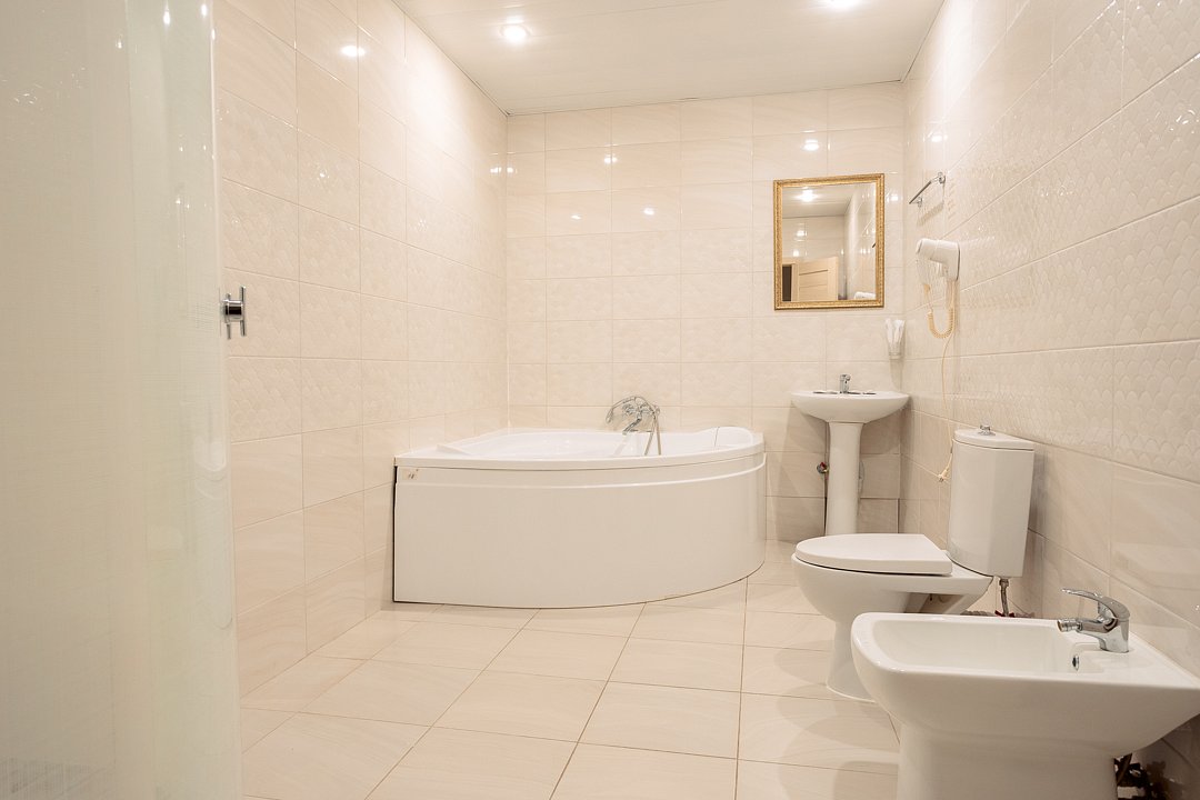 В ванной комнате душевая кабина и/или гидромассажная ванна, туалет, раковина, комплект полотенец, фен, бесплатные гигиенические принадлежности.
