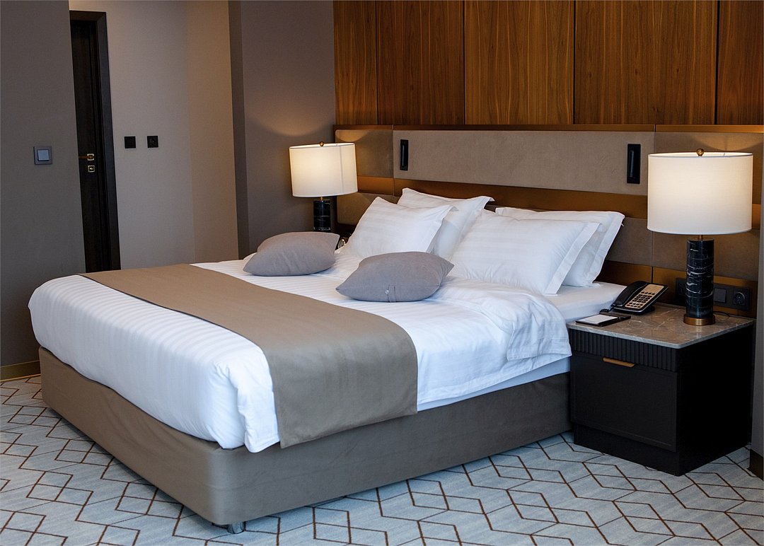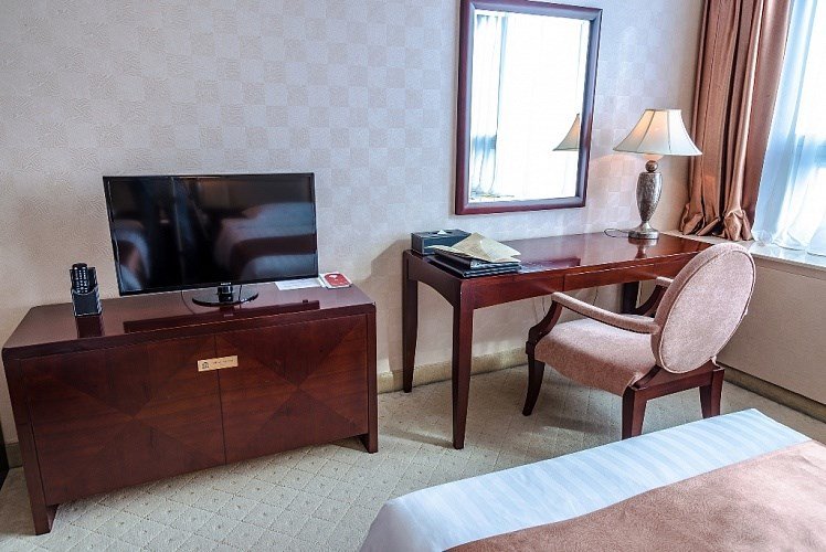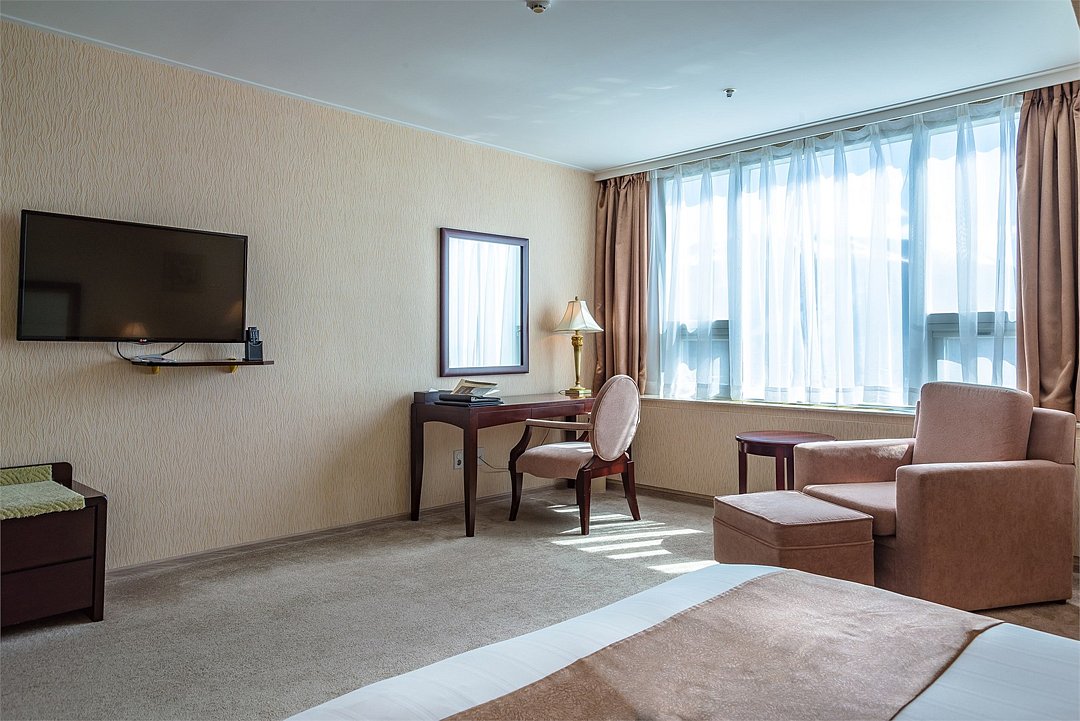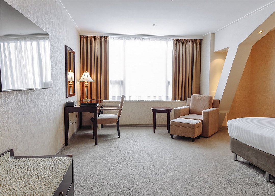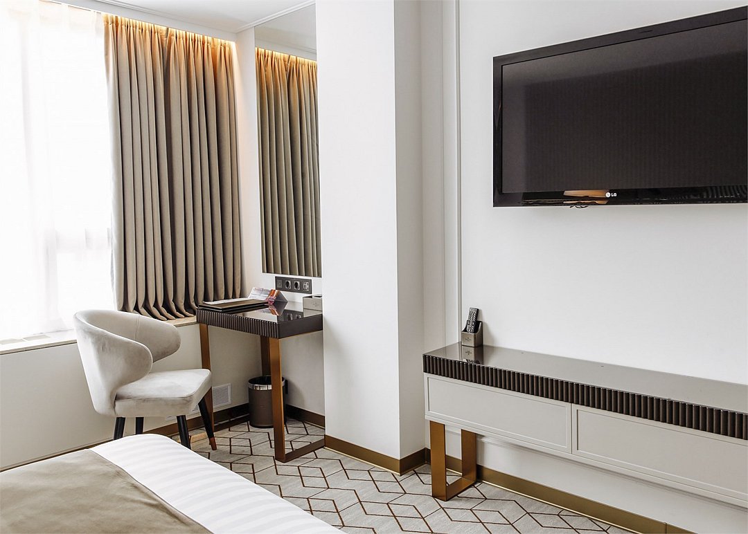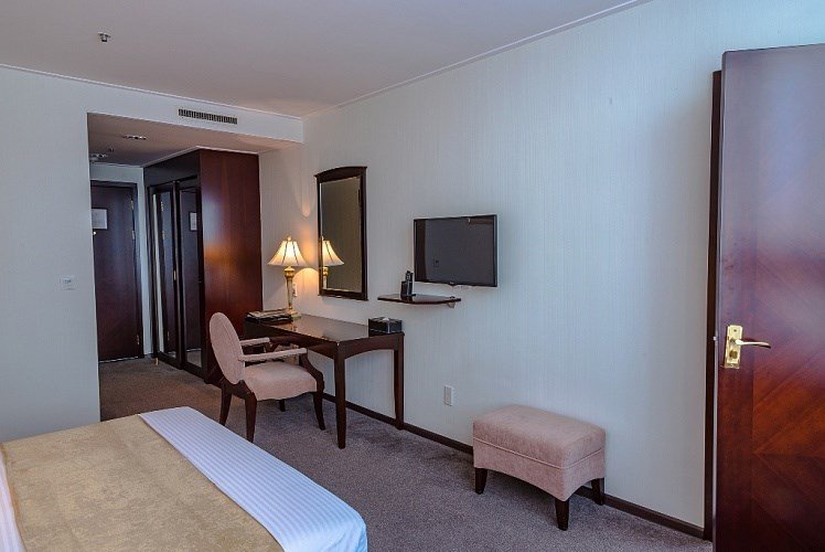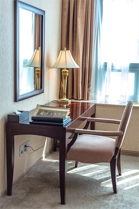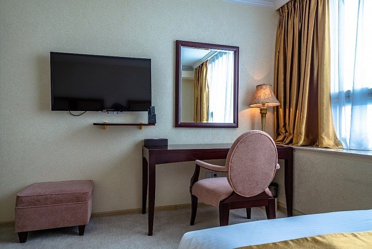 Классический номер с уютным интерьером для двухместного размещения. Стандартный номер располагает удобной комнатой с большой двуспальной кроватью, ванной комнатой с совмещенным санузлом. В номере: рабочий стол, сейф, мини-бар, кабельное телевидение, телефон, система климат-контроля. Гость не почувствует себя одиноким, благодаря высокому сервису и вниманию сотрудников отеля.Услуги и удобства