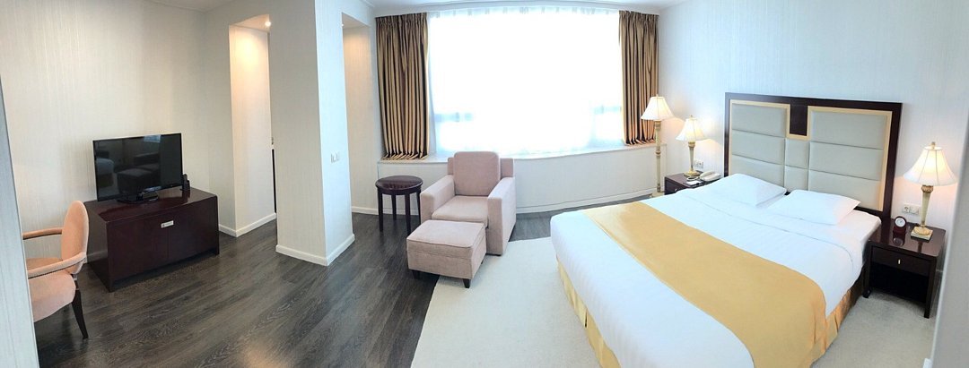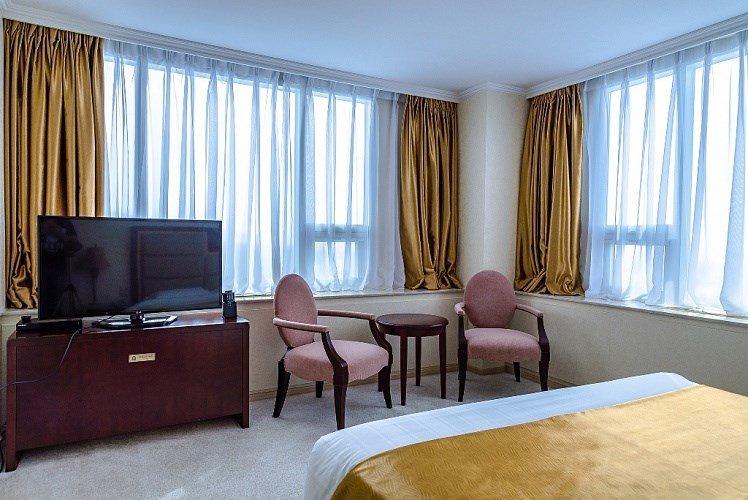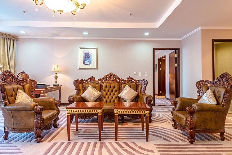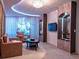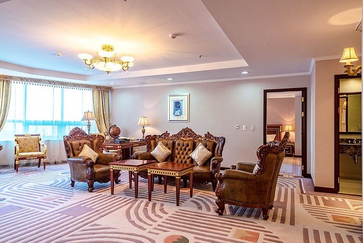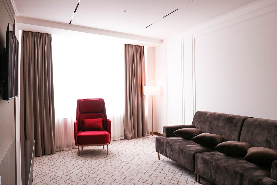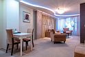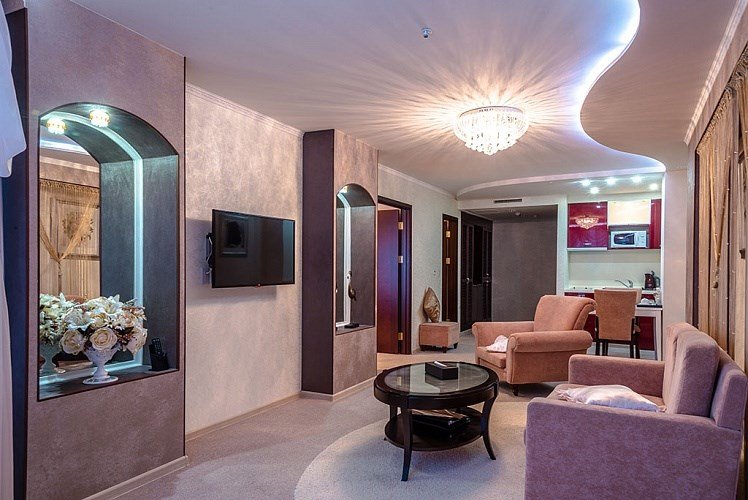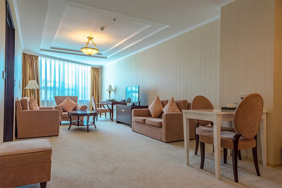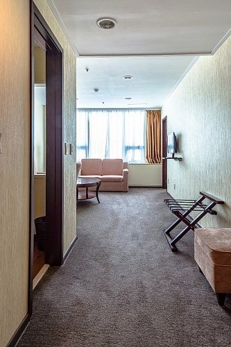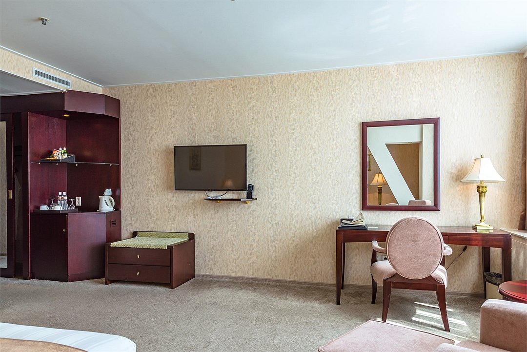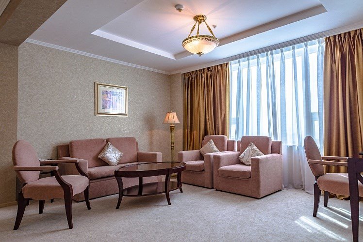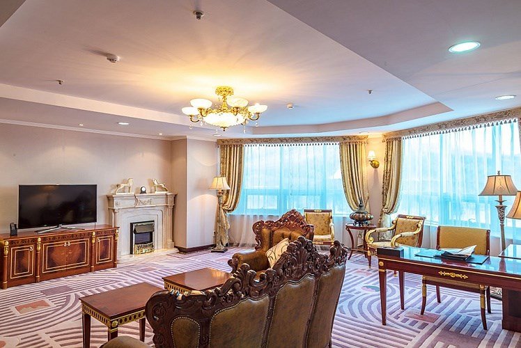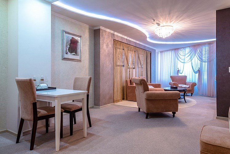 Номер может удовлетворить даже короля: просторная гостиная, кухня, две спальни и большая ванная комната делают этот номер удобным для проживания VIP-гостей с друзьями или целой семьей. Два рабочих места и три кровати позволяют сделать из апартаментов настоящий дом для нескольких семей, где можно и работать, и отдыхать. А в конце дня собираться всем вместе перед телевизором в гостиной на большом диване и мягких креслах. В номере: 3 телевизора, 4 телефона, Интернет, спутниковое телевидение, система климат-контроля, комплект офисных принадлежностей, душевая, ванна. Для проживающих в гостинице следующие виды услуг предоставляются бесплатно: посещение сауны, посещение фитнес клуба, бесплатный Wi-Fi на первом этаже. В стоимость включен завтрак.Услуги и удобства