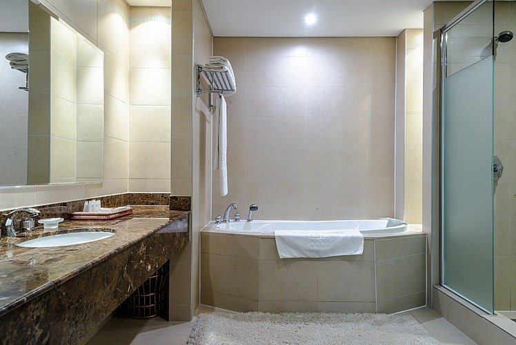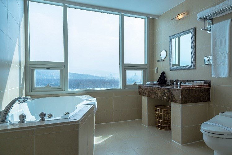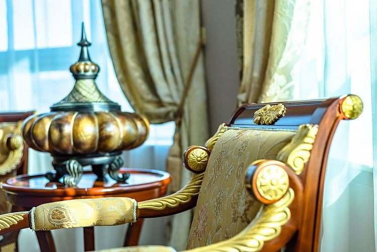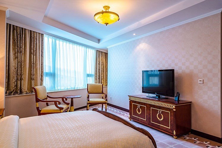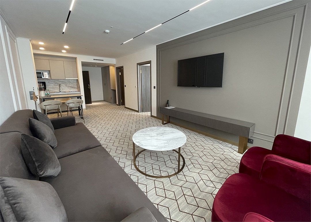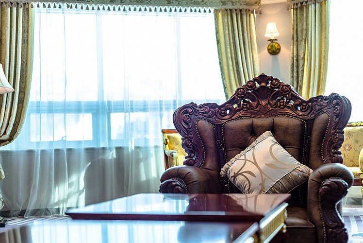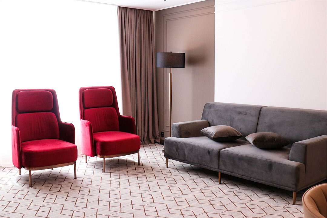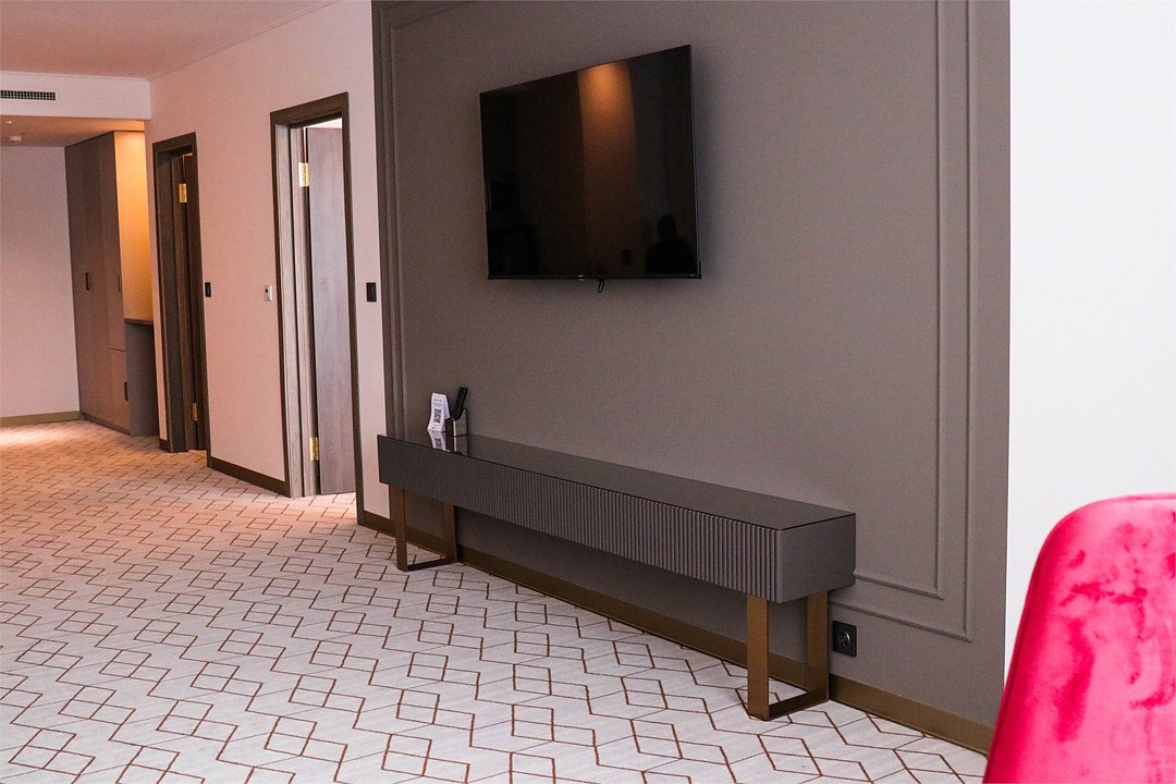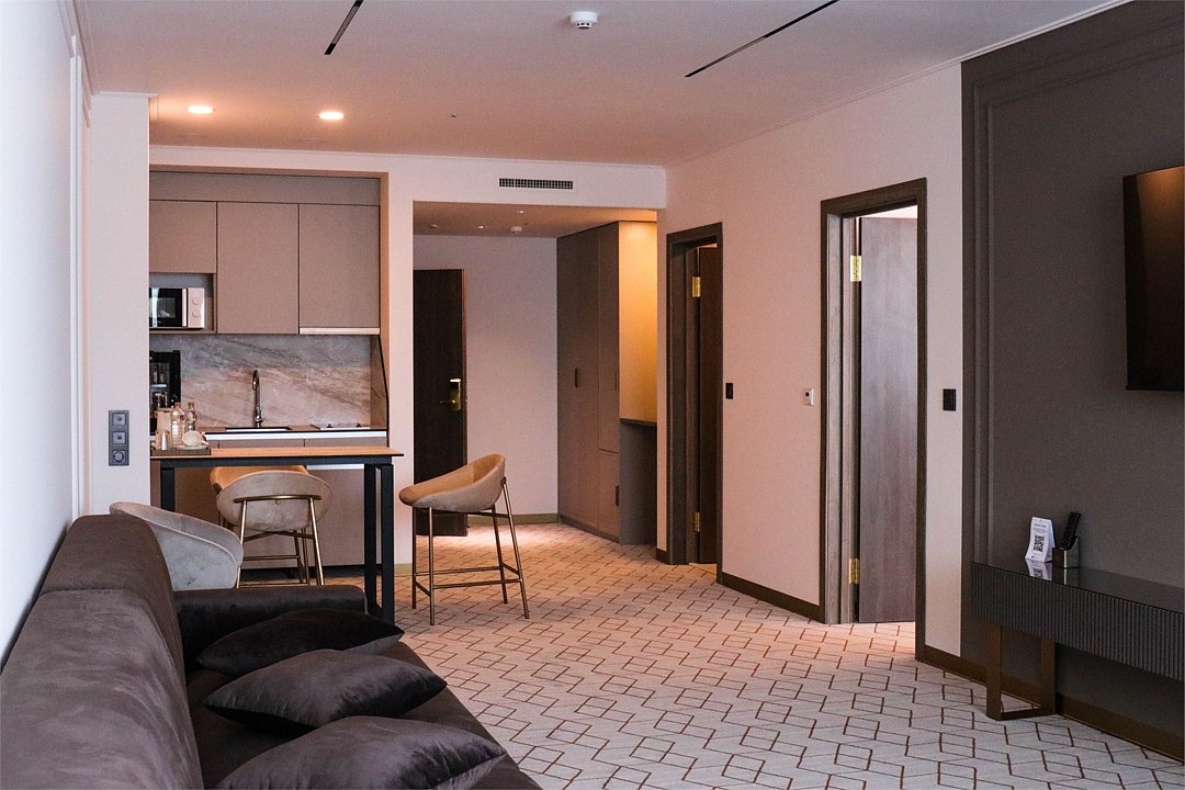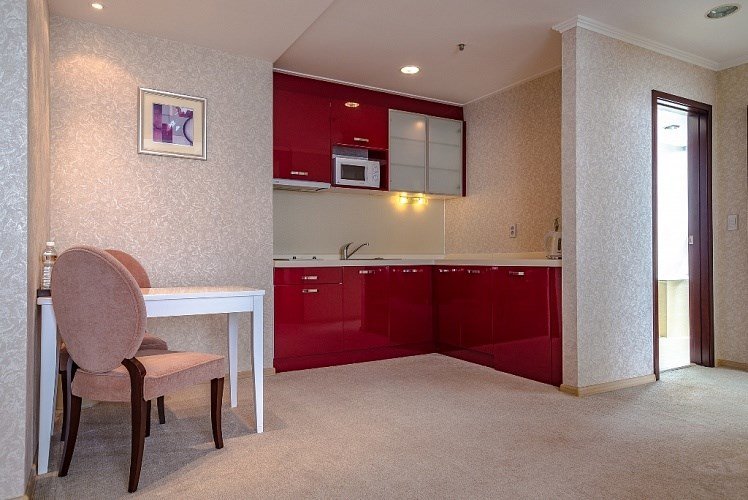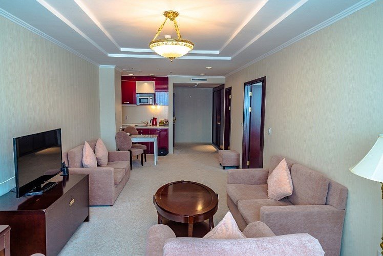Номер может удовлетворить даже короля: просторная гостиная, кухня, две спальни и большая ванная комната делают этот номер удобным для проживания VIP-гостей с друзьями или целой семьей. Два рабочих места и три кровати позволяют сделать из апартаментов настоящий дом для нескольких семей, где можно и работать, и отдыхать. А в конце дня собираться всем вместе перед телевизором в гостиной на большом диване и мягких креслах. В номере: 3 телевизора, 4 телефона, Интернет, спутниковое телевидение, система климат-контроля, комплект офисных принадлежностей, душевая, ванна. Для проживающих в гостинице следующие виды услуг предоставляются бесплатно: посещение сауны, посещение фитнес клуба, бесплатный Wi-Fi на первом этаже. В стоимость включен завтрак.Услуги и удобства