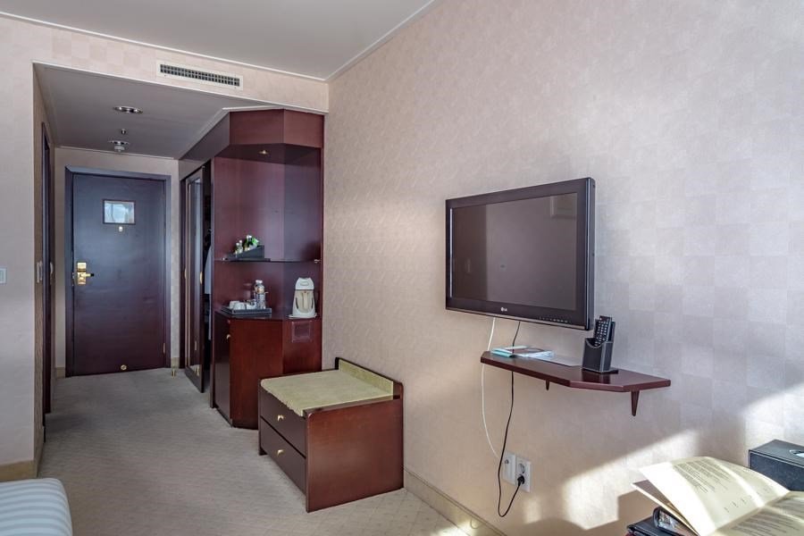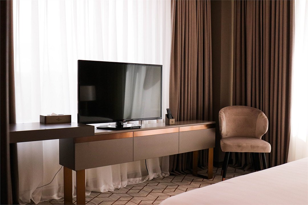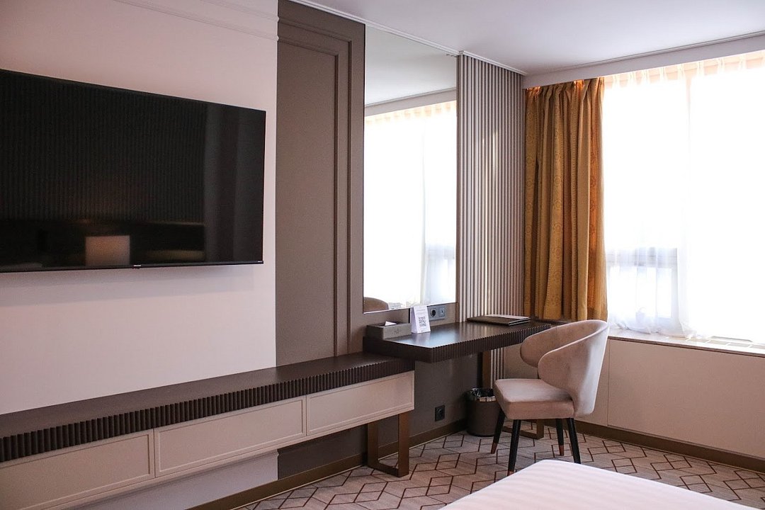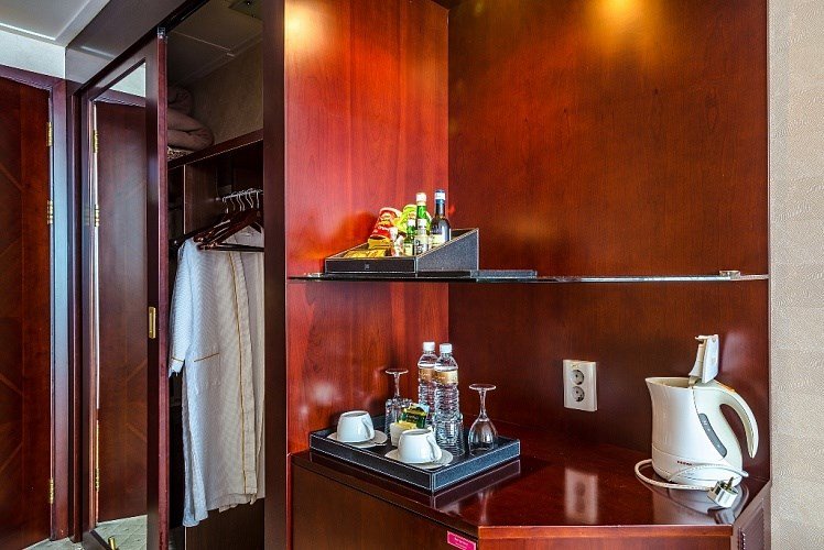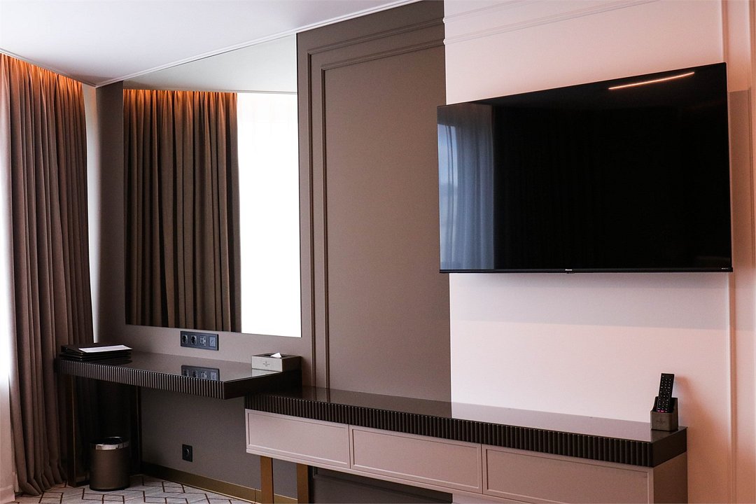 телевизор, Wi-Fi, телефон, фен, электронные замки, душевая кабина, банные принадлежности, халаты, банные полотенца, тапочки, косметические средства, кровать «King size», кухня, мини-бар, чайный набор, информационная карта, меню, сейф, чайник, питьевая вода, вид на город, сплит-система, вид на парк, мини-холодильник, вид на горы, без питомцевВ гостиничном номере