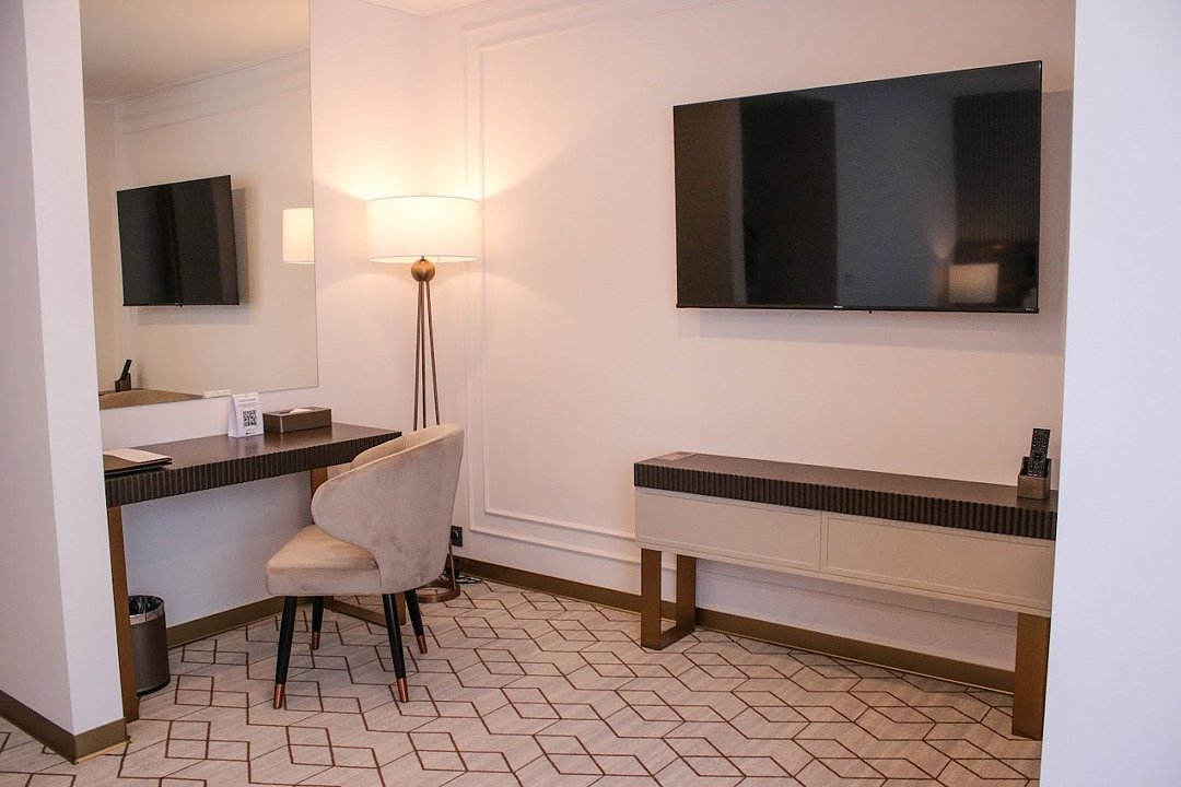 телевизор, кабельное телевидение, Wi-Fi, телефон, система климат-контроля, фен, утюг, ванная комната, санузел, халаты, тапочки, гигиенические средства, косметические средства, кровать «King size», две полутораспальные кровати, гладильная доска, тумбы, шкаф для одежды, гардеробная, вешалки, журнальный столик, багажная тумба, зеркало, пуфики, две комнаты, мини-бар, письменные принадлежности, свежая пресса, чайный набор, обслуживание номеров, сейф, чайник, раковина, питьевая вода, кресло, ламинат, стаканы, туалетный столик, стул, тумба, внутренний телефон, мини-холодильник, вид на горы, номер для некурящих, антибактериальное средство для рук, средства индивидуальной защиты, фитнес-зона, уборка номера, набор для приготовления чая и кофе, услуги прачечной (платно), вешалки-плечики, бутилированная вода, без питомцевВ гостиничном номере