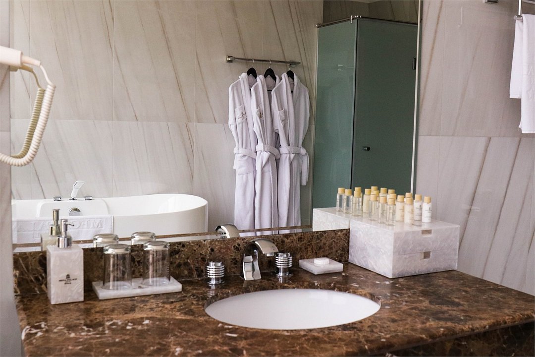телевизор, Wi-Fi, телефон, фен, электронные замки, душевая кабина, ванна, банные принадлежности, халаты, банные полотенца, тапочки, косметические средства, кровать «King size», письменный стол, кухня, мини-бар, чайный набор, информационная карта, меню, сейф, чайник, питьевая вода, вид на город, две ванные комнаты, сплит-система, вид на парк, мини-холодильник, вид на горы, без питомцевВ гостиничном номере