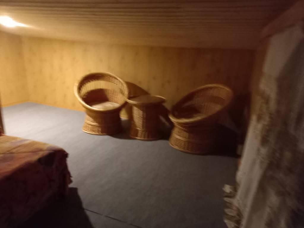 Второй этаж мансардный — крутая лестница, низкий потолок, спальня.