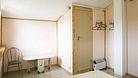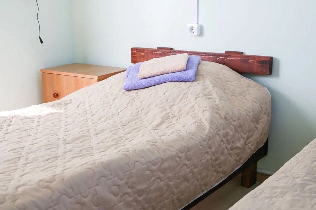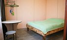 12 кв.м., 2-спальная кровать, стол, с/у с душем. Общая кухня с холодильником, микроволновой печью.