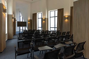 Конференц-зал оснащен эргономичной мебелью и высокотехнологичным оборудованием: интрактивная доска с возможностью проводного и беспроводного подключения устройств. Дополнительно возможно предоставление микрофонов, колонок и микшера, флипчарта с набором маркеров и бумаги.