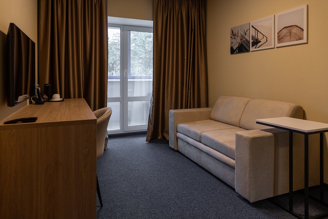 Номера этой категории расположены на 2-4 этажах и имеют панорамный вид из окон на лес (балкон отсутствует). Просторная гостиная комната создаёт идеальные условия для отдыха и релаксации, а спальня — для уединения, с комфортом восстановить силы после насыщенного дня.