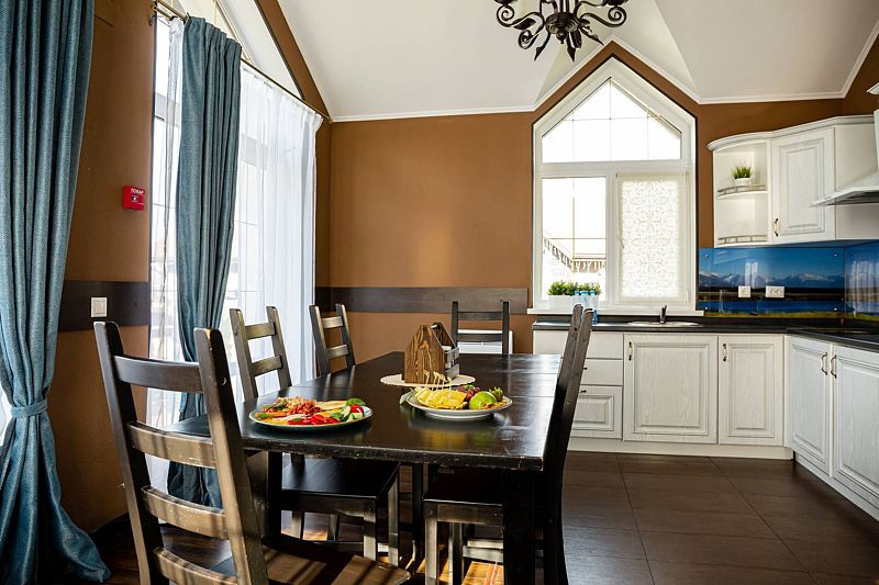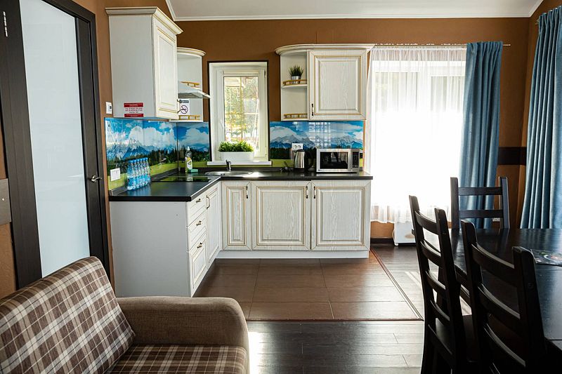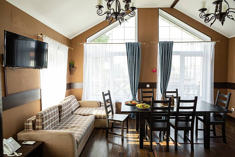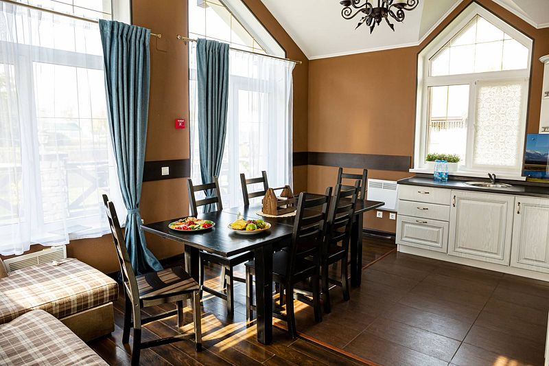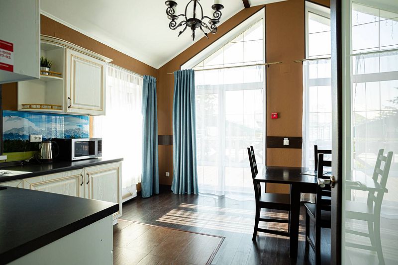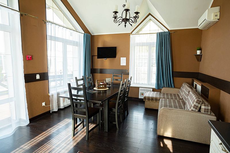 В коттедже расположена большая гостиная с кухней, 3 отдельных номера и отдельная большая веранда. С балконов второго этажа открывается вид на весь гостиничный комплекс, создавая душевную атмосферу и позволяя полностью отдалиться от повседневной суеты. А веранда специально создана для того, чтобы провести время с полным ощущением благородного расслабляющего отдыха.