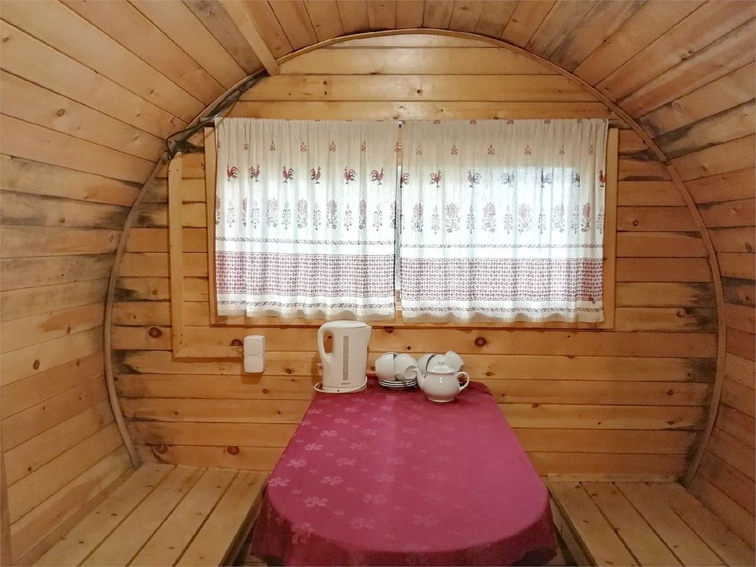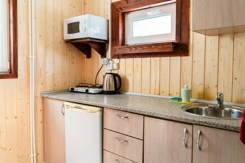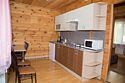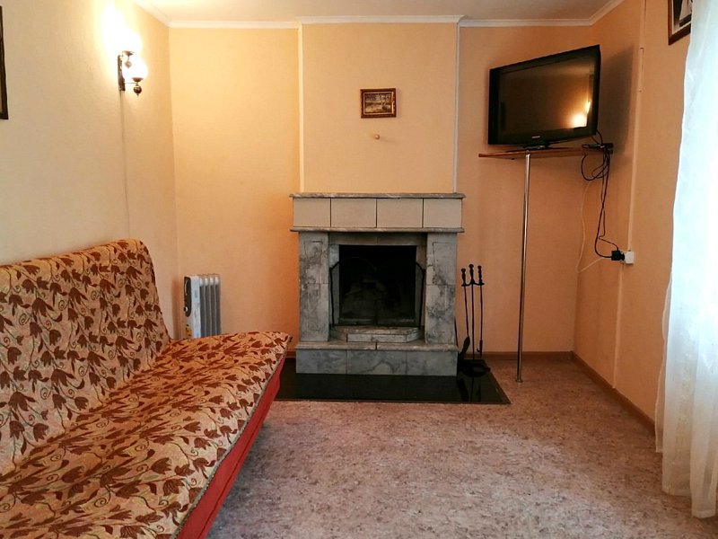2 спальни с двуспальными кроватями, комната с диваном и камином, кухня с кухонным гарнитуром, столовая комната, санузел, телевизор, электрическая плита, электрический чайник, холодильник, микроволновая печь, комплект посуды на шесть человек. Возле дома находится большая беседка и мангал.