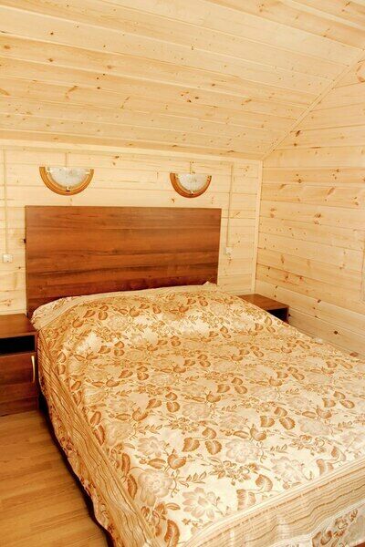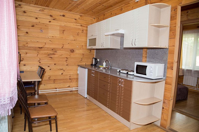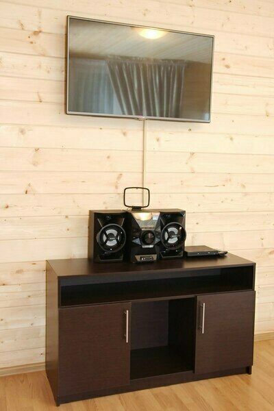 Спальня с двуспальной кроватью, спальня с двумя полутороспальными кроватями, кухня с кухонным гарнитуром, санузел, телевизор, электрическая плита, электрический чайник, холодильник, комплект посуды на шесть человек. Возле дома находится большая беседка и мангал.