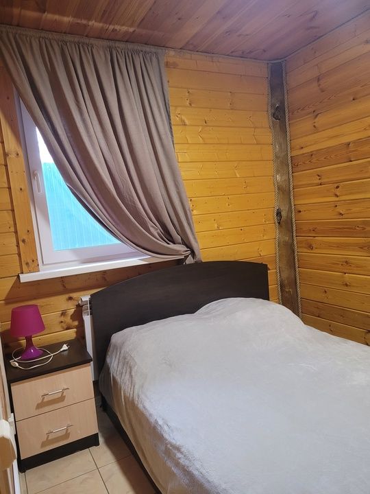 В доме две спальни. В первой спальне двуспальная кровать, 2 прикроватные тумбы со светильниками, стул, ТВ. Во второй спальне двуспальная кровать, прикроватная тумба, стул, светильник, ТВ. В доме есть открытая небольшая веранда со столом и лавками на шесть человек. На улице, перед домом своя огороженная территория с мангальной зоной, зеленые насаждения