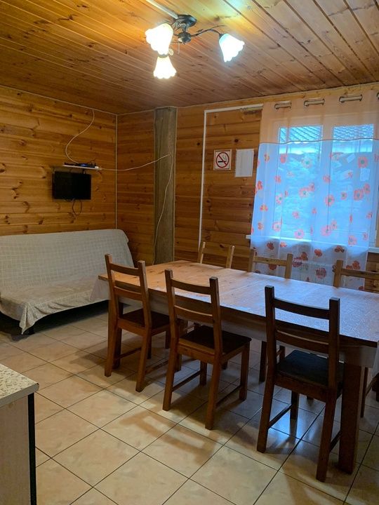 На первом этаже коттеджа расположена кухонная зона со всей необходимой техникой (холодильник, СВЧ, плита, электрочайник, посуда на 10 персон, столовые приборы, кастрюля, сковорода, тарелки двух видов, бокалы) , стол раскладной, стулья, плазменный телевизор и раскладывающийся мягкий диван.
