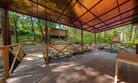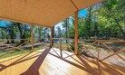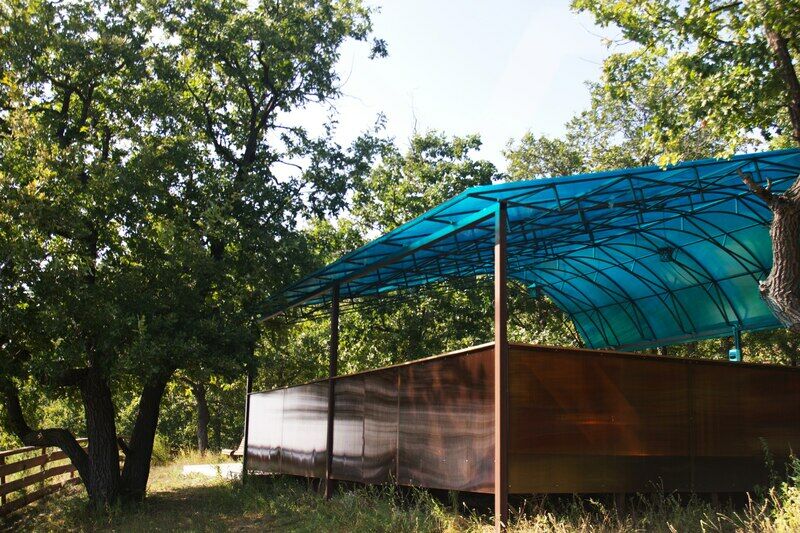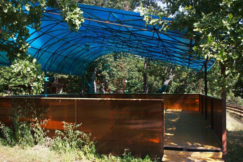 Большая беседка с полупрозрачной крышей, столы, стулья, мангал, розетки, освещение.