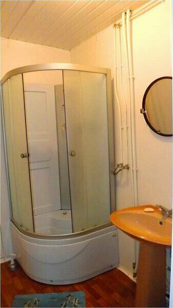 На 1 этаже: гостиная, диван, два кресла, телевизор, чайник, холодильник, шкаф, стол, стулья, туалет, душ.