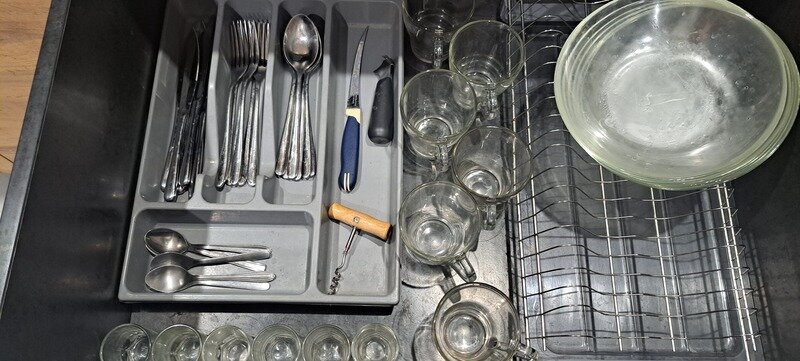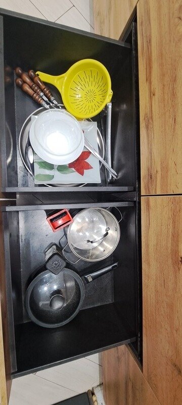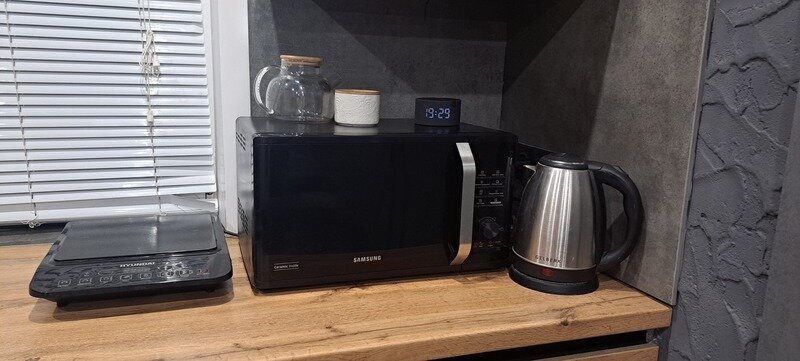 - чайник, микроволновка, холодильник, приборы , посуда.