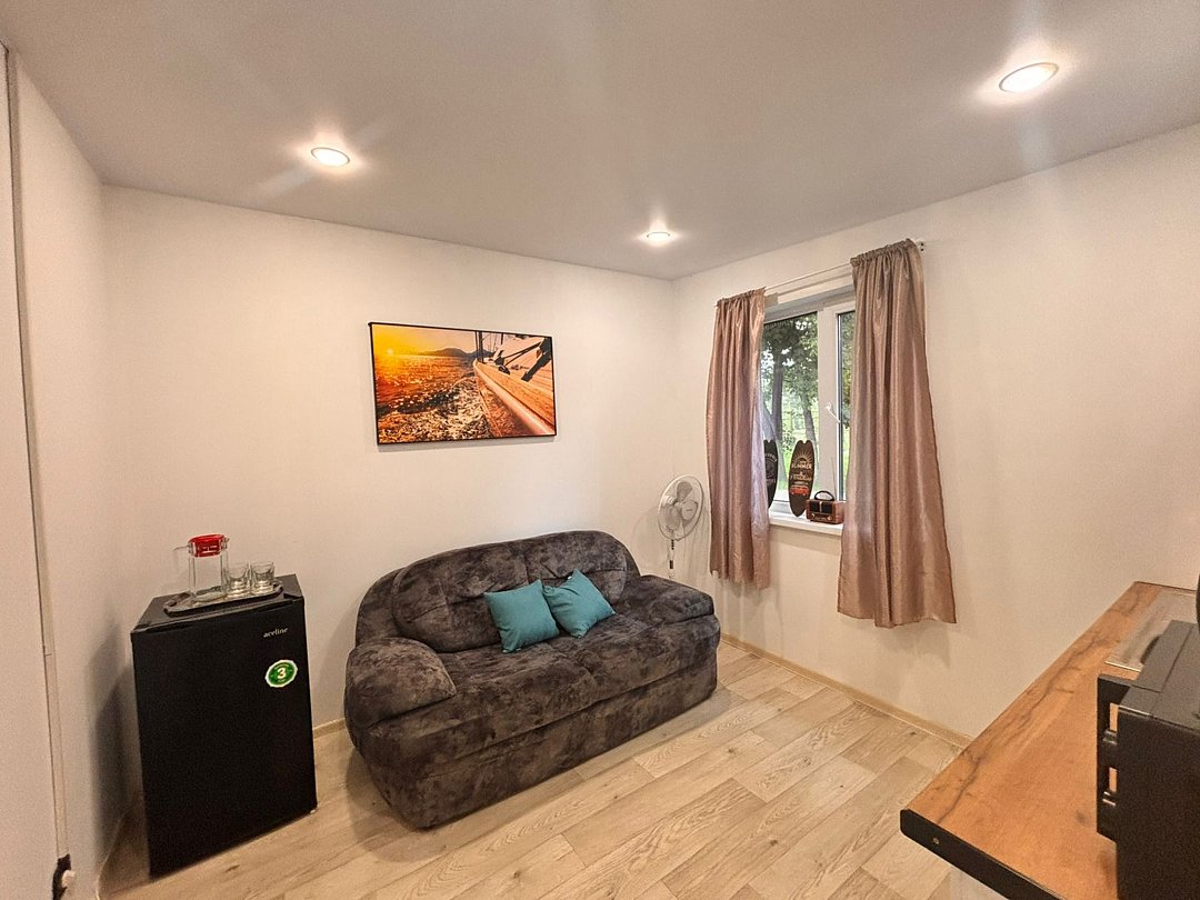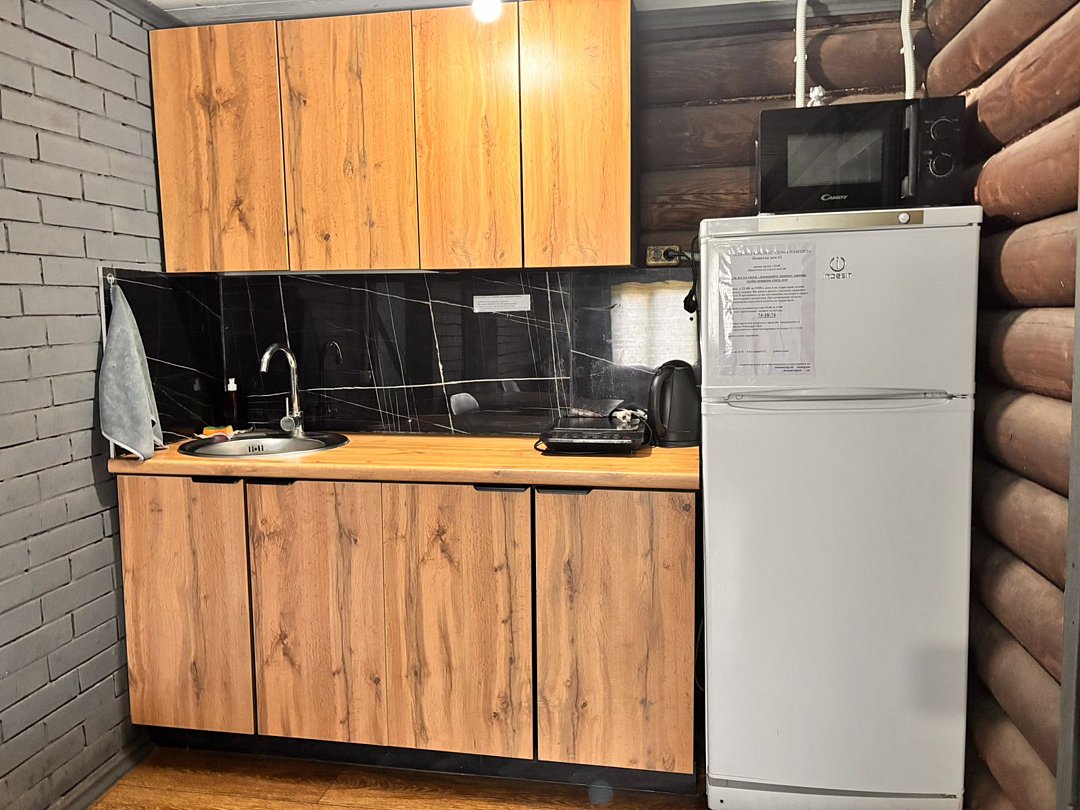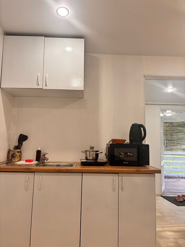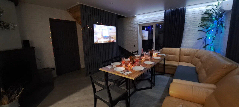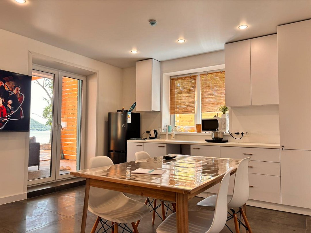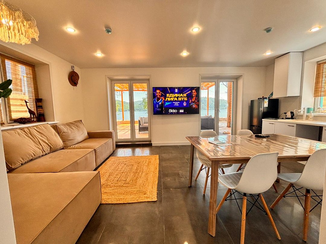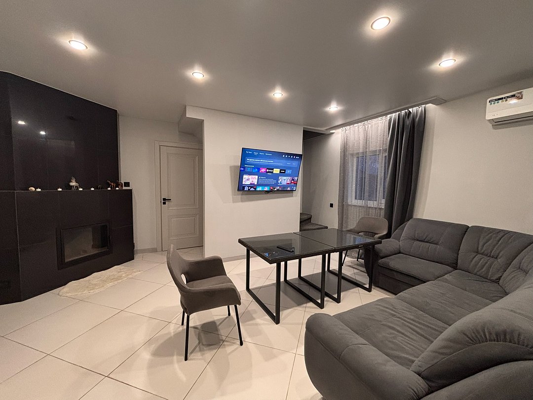На 1-ом этаже гостиная с диваном, ТВ, Алиса колонка, Wi-Fi, кухня со всем необходимым (холодильник, чайник, микроволновка, посуда, приборы, кастрюля, сковородка).