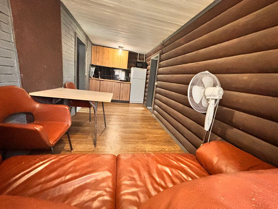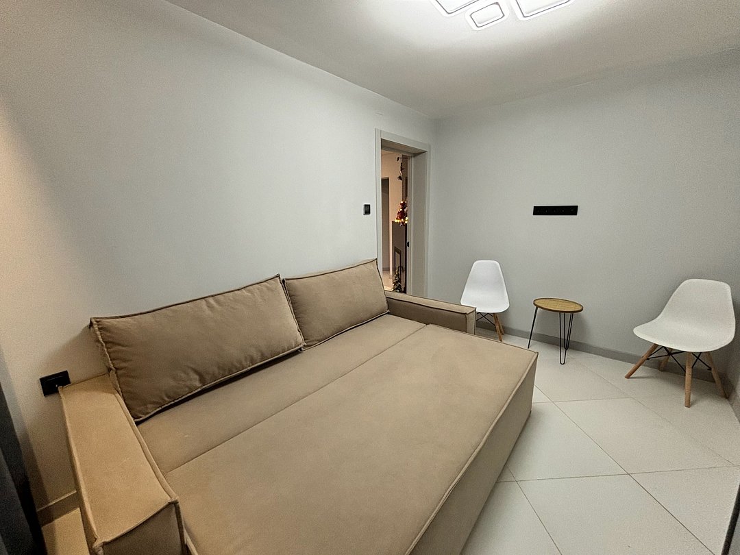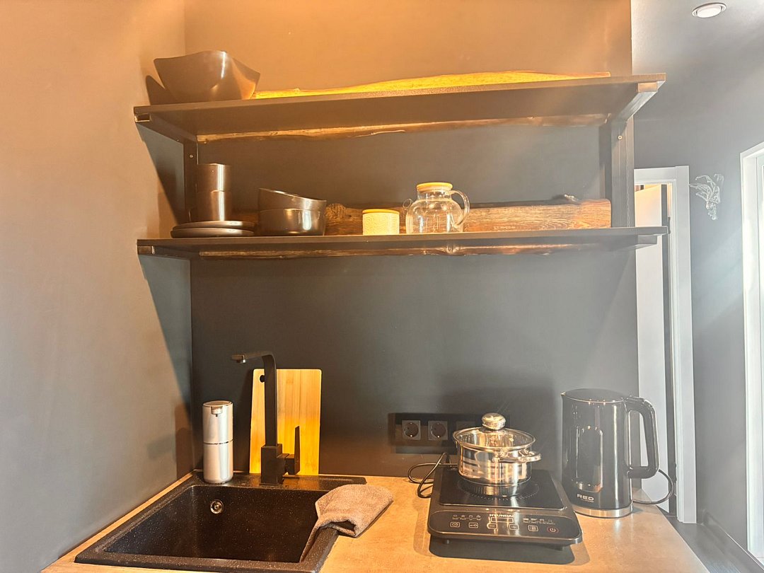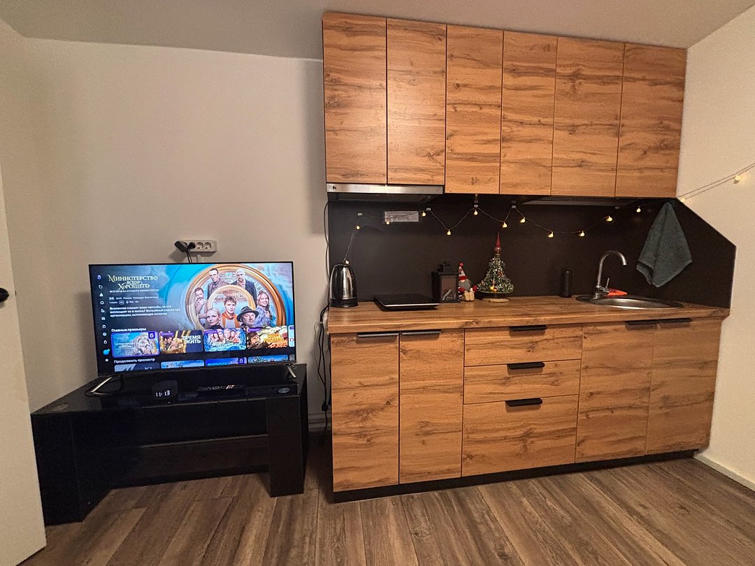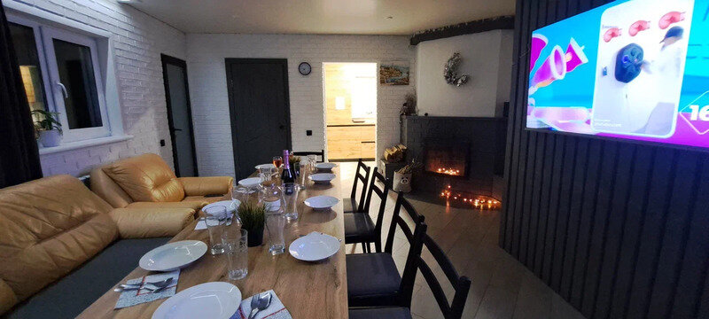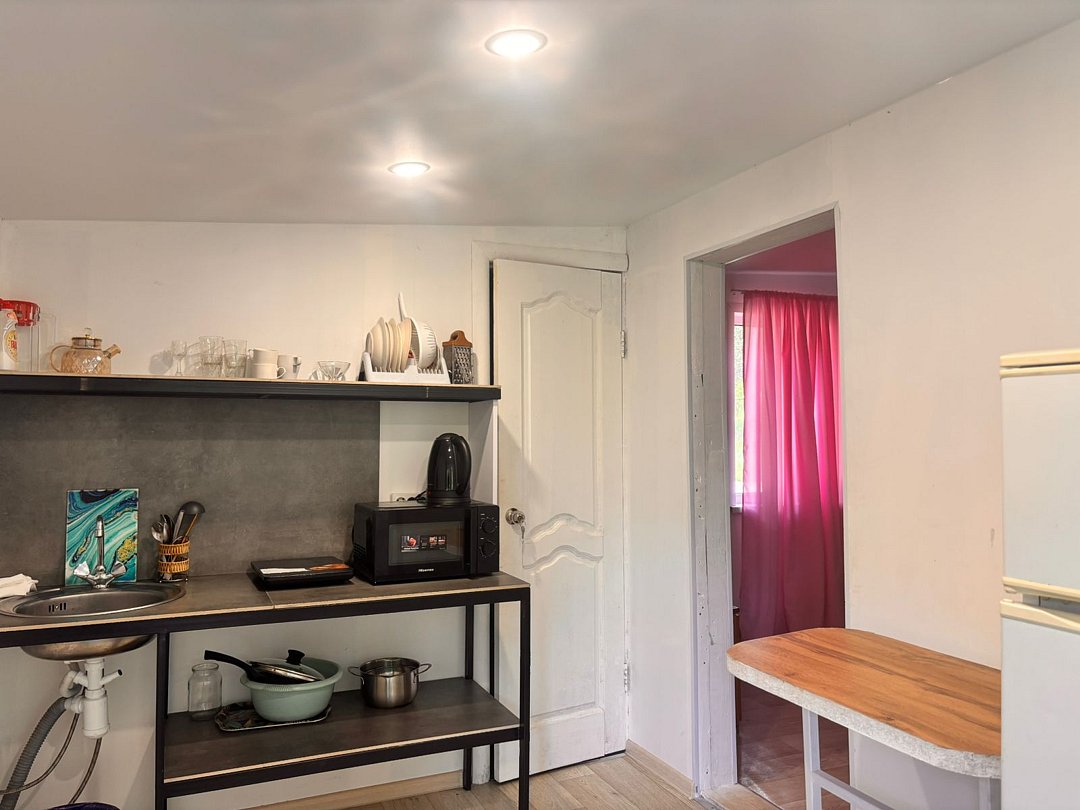 На 1-ом этаже гостиная с диваном, ТВ, Алиса колонка, Wi-Fi, кухня со всем необходимым (холодильник, чайник, микроволновка, посуда, приборы, кастрюля, сковородка).