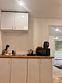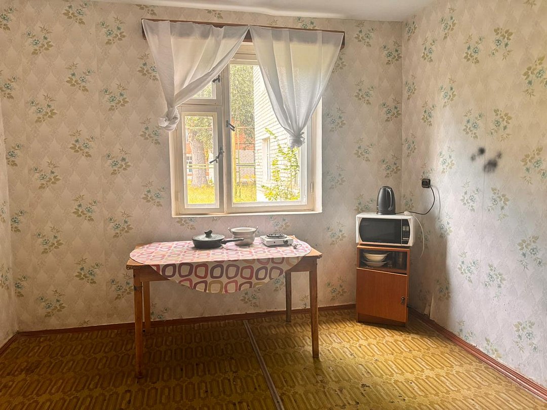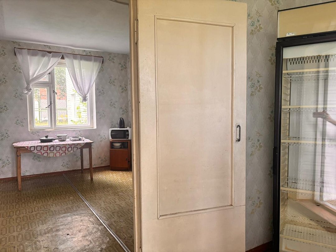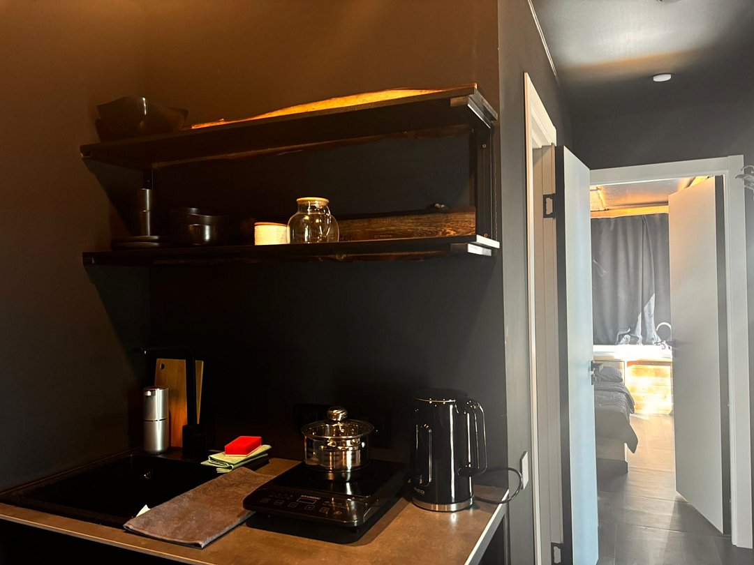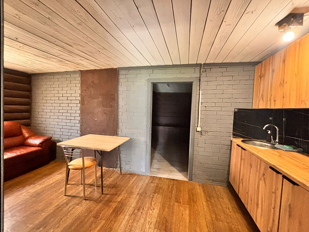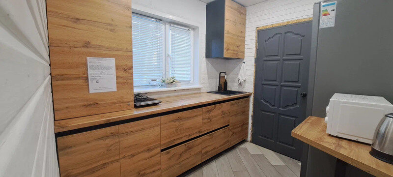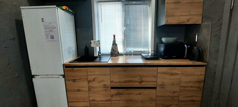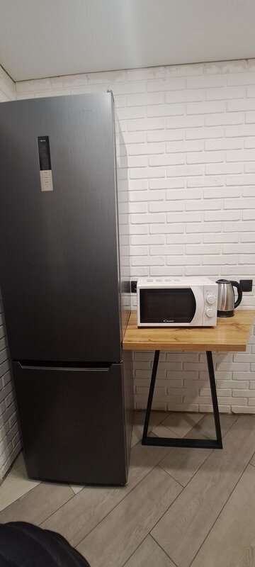 На 1-ом этаже гостиная с диваном, ТВ, Алиса колонка, Wi-Fi, кухня со всем необходимым (холодильник, чайник, микроволновка, посуда, приборы, кастрюля, сковородка).