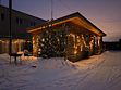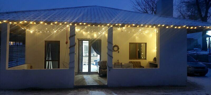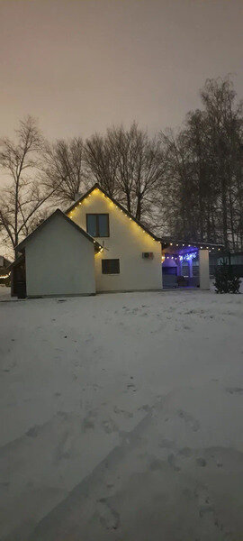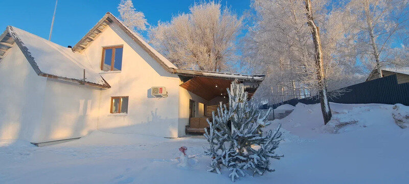 Уютный белый дом с камином и сауной расположен по адресу: полуостров Копылово, ул. Бурлацкая, д. 7.