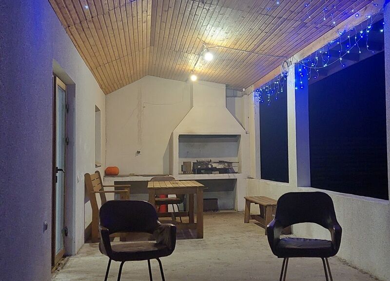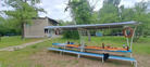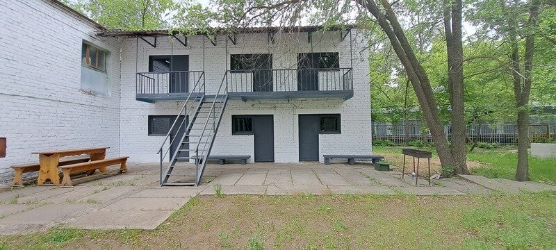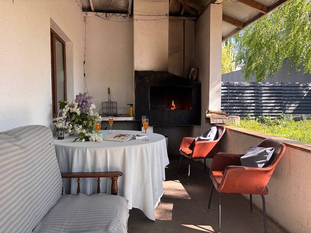 На улице находится мангал на улице с решеткой, столы и лавочки.