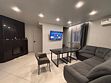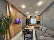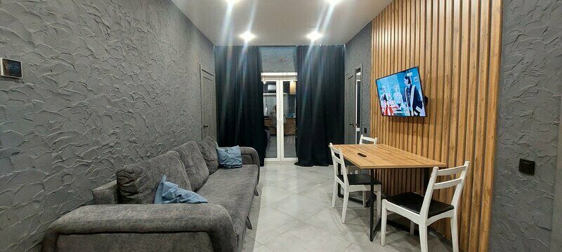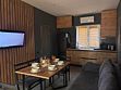 Оснащение: диван, большой стол, стулья, настенный телевизор, кухонный уголок с чайником, микроволновкой, плиткой и набором посуды, односпальные кровати и туалетные принадлежности.