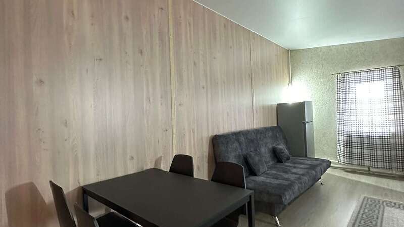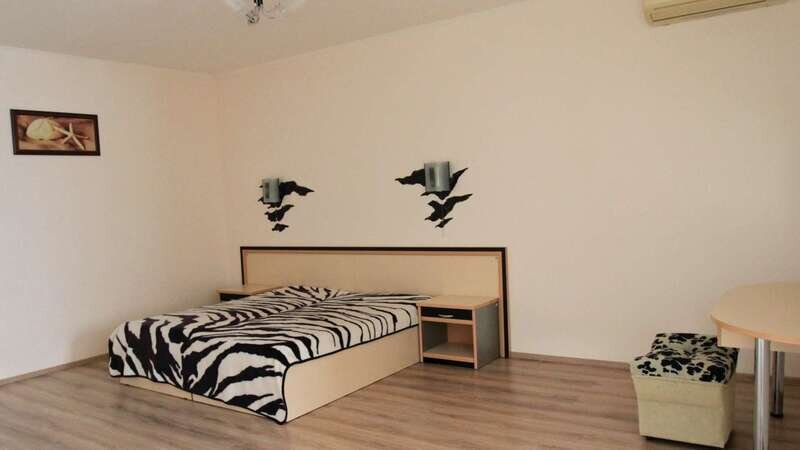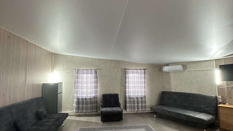 Большая гостиная с кухонным гарнитуром, две больших спальных комнаты, двуспальная кровать (две односпальные кровати) в каждой комнате, двуспальный диван (два односпальных кресла) в гостиной, телевизор, кондиционер, холодильник, набор посуды, чайник, душ.